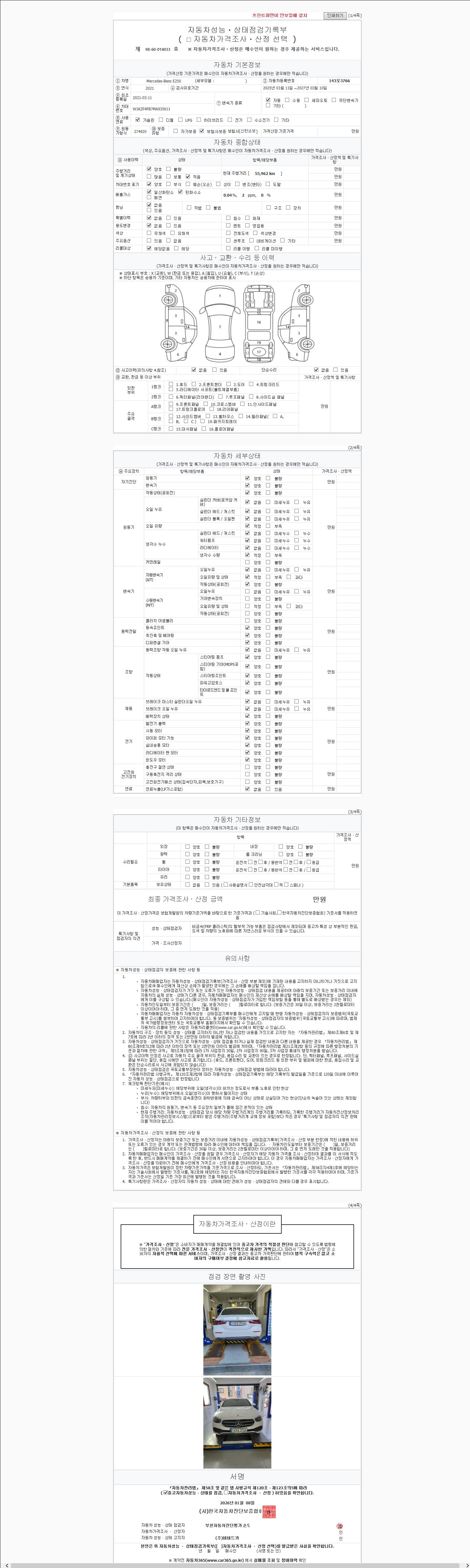 | 주행거리 | 55,909 km | 차량번호 | 143오3766 | 사고유무 | 성능기록부 참조 | 제시번호 | 제 2026004496 호 |
