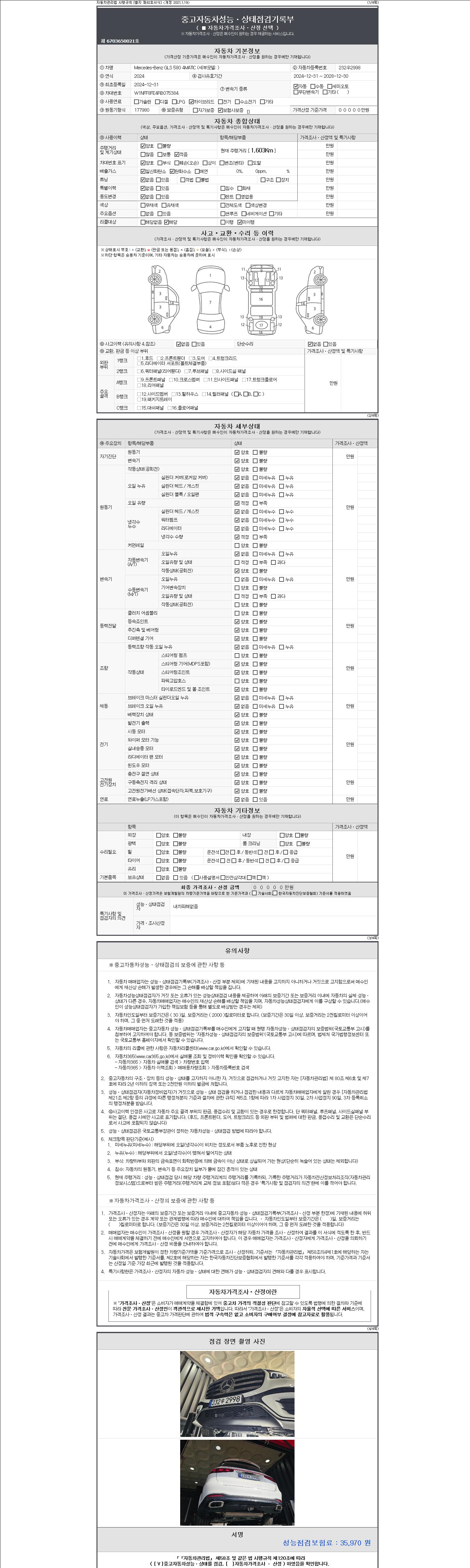 자동차관리법 시행규칙 제120조의 규정에 따라 별지 제 82호서식 《중고자동차 성능, 상태점검 기록부》를 발행한 성능, 상태점검자 및 매매자는 아래의 보증기간 또는 보증거리 이내의 중고자동차, 성능점검 기록부에 기재된 내용과 자동차의 실제 성능, 상태가 다른 경우 계약 또는 관계법령에 따라 매수인에 대하여 책임을 집니다.