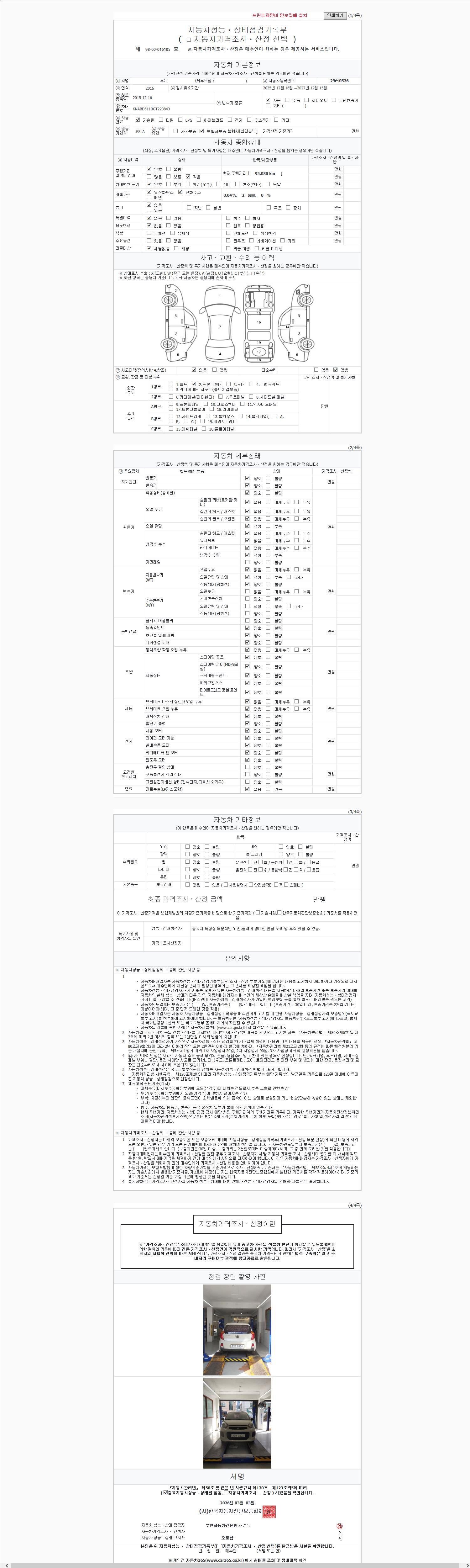 | 주행거리 | 95,023 km | 차량번호 | 29러0526 | 사고유무 | 성능기록부 참조 | 제시번호 | 제 2026039176 호 |