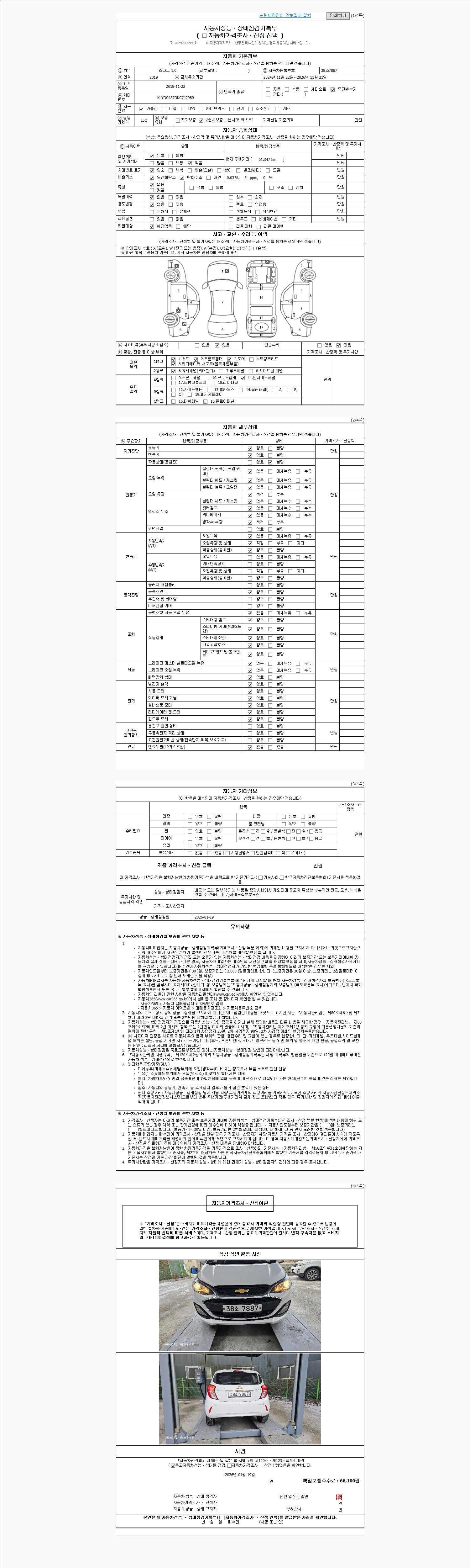 | 주행거리 | 61,347 km | 차량번호 | 38소7887 | 사고유무 | 성능기록부 참조 | 제시번호 | 제 2026003375 호 |