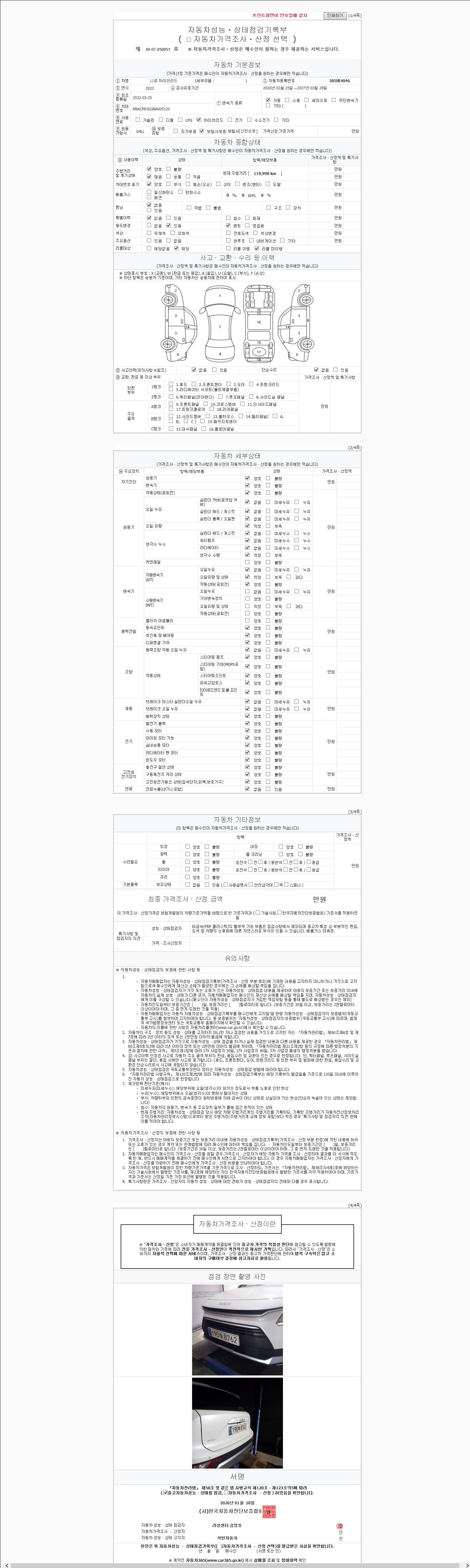 자동차관리법 시행규칙 제120조의 규정에 따라 별지 제 82호서식 《중고자동차 성능, 상태점검 기록부》를 발행한 성능, 상태점검자 및 매매자는 아래의 보증기간 또는 보증거리 이내의 중고자동차, 성능점검 기록부에 기재된 내용과 자동차의 실제 성능, 상태가 다른 경우 계약 또는 관계법령에 따라 매수인에 대하여 책임을 집니다.