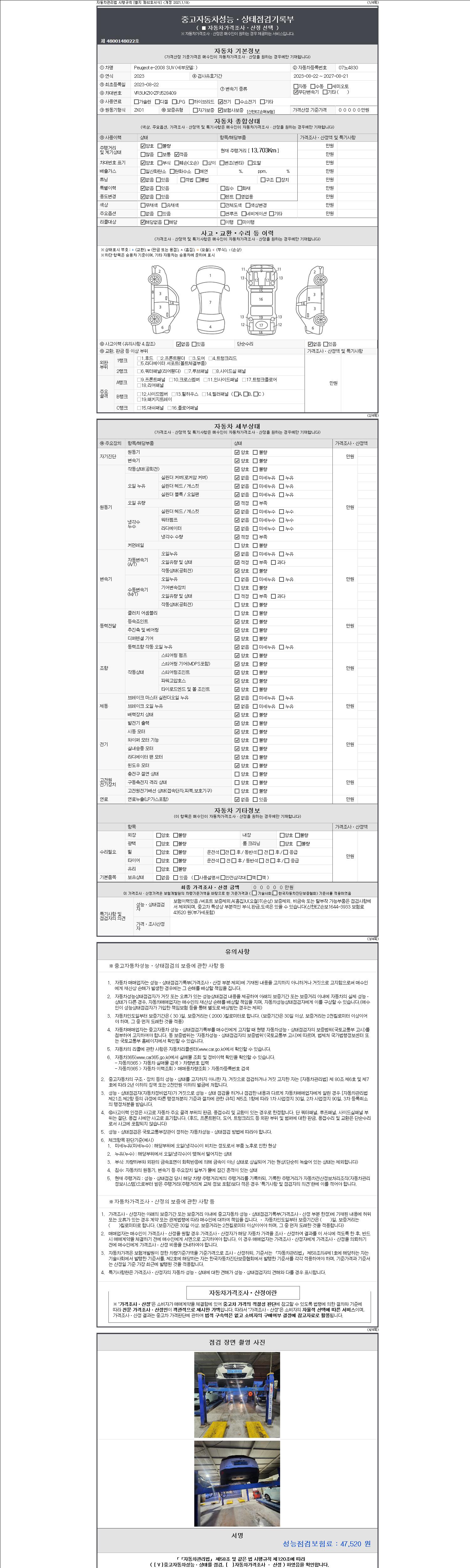 | 주행거리 | 13,001 km | 차량번호 | 07노4830 | 사고유무 | 성능기록부 참조 | 제시번호 | 제 2147483647 호 |