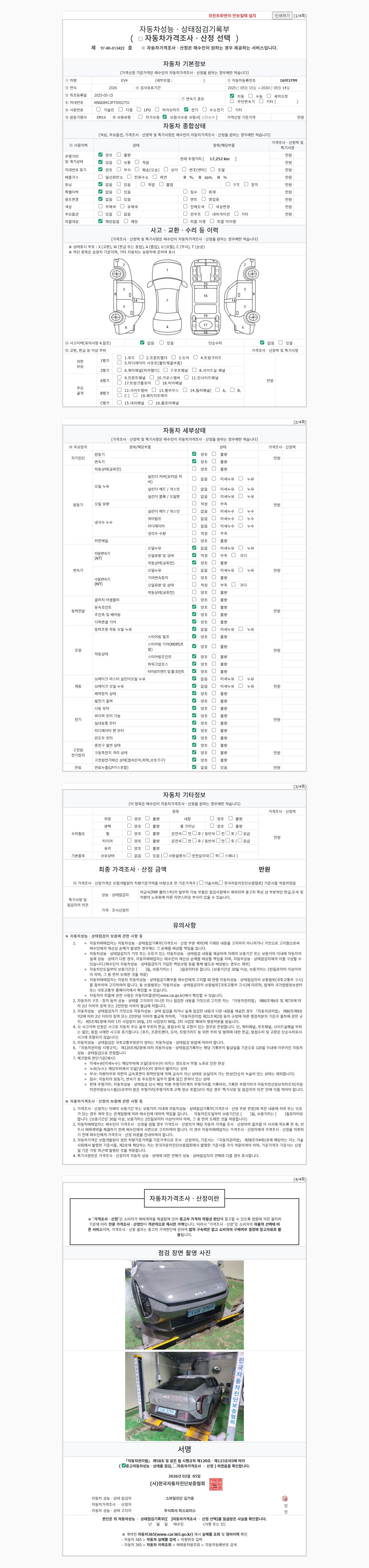 자동차관리법 시행규칙 제120조의 규정에 따라 별지 제 82호서식 《중고자동차 성능, 상태점검 기록부》를 발행한 성능, 상태점검자 및 매매자는 아래의 보증기간 또는 보증거리 이내의 중고자동차, 성능점검 기록부에 기재된 내용과 자동차의 실제 성능, 상태가 다른 경우 계약 또는 관계법령에 따라 매수인에 대하여 책임을 집니다.