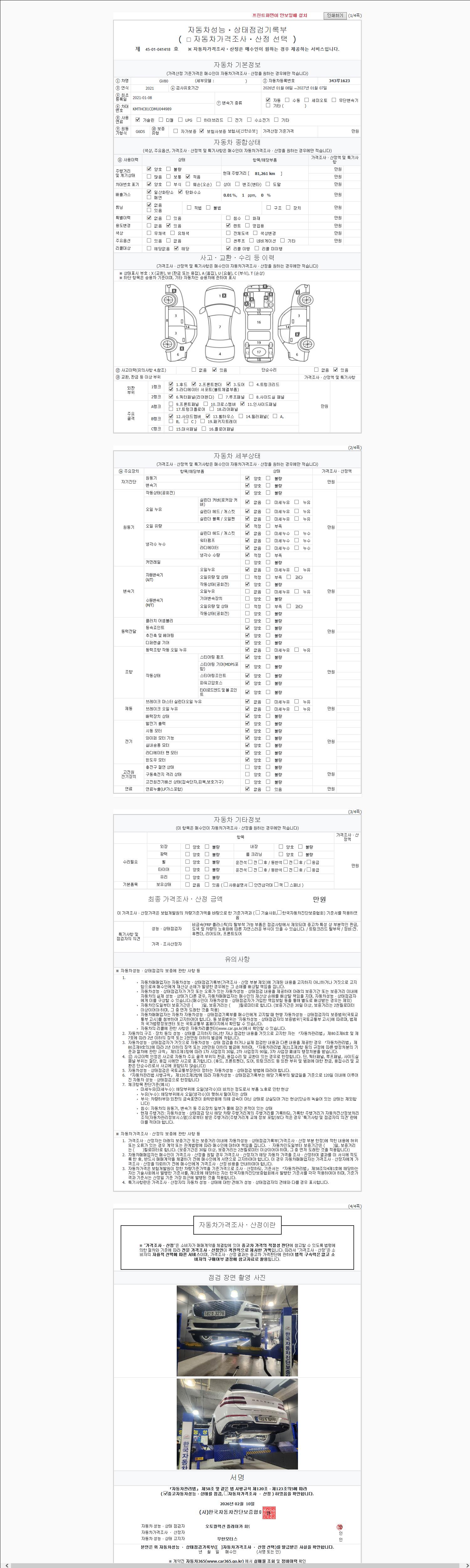 | 주행거리 | 81,261 km | 차량번호 | 343루1623 | 사고유무 | 성능기록부 참조 | 제시번호 | 제 2147483647 호 |
