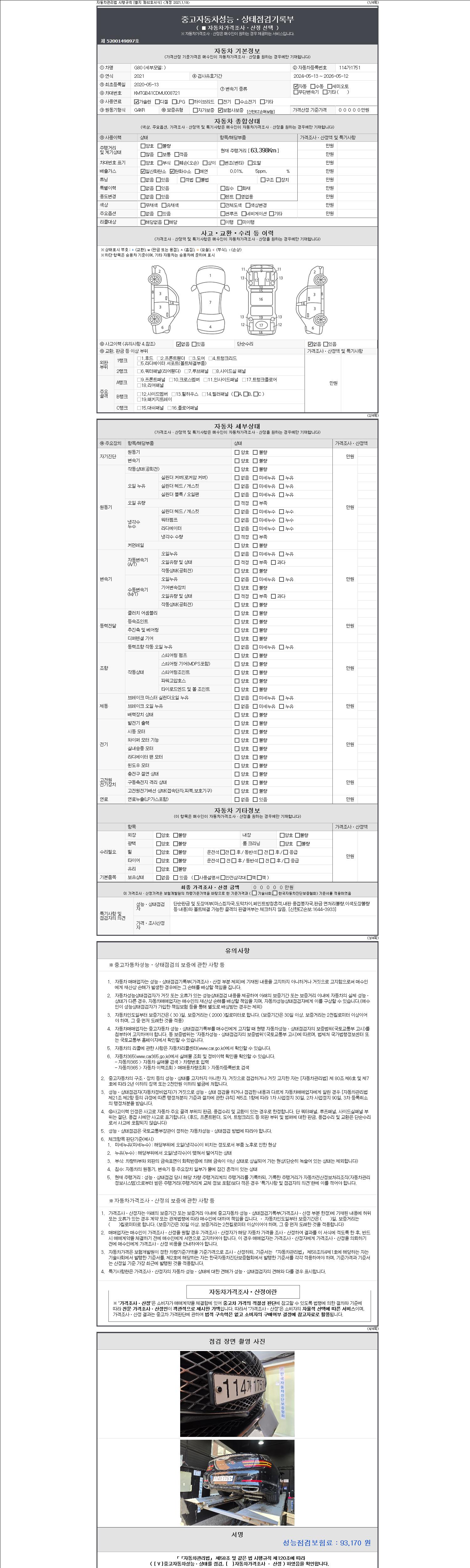 자동차관리법 시행규칙 제120조의 규정에 따라 별지 제 82호서식 《중고자동차 성능, 상태점검 기록부》를 발행한 성능, 상태점검자 및 매매자는 아래의 보증기간 또는 보증거리 이내의 중고자동차, 성능점검 기록부에 기재된 내용과 자동차의 실제 성능, 상태가 다른 경우 계약 또는 관계법령에 따라 매수인에 대하여 책임을 집니다.