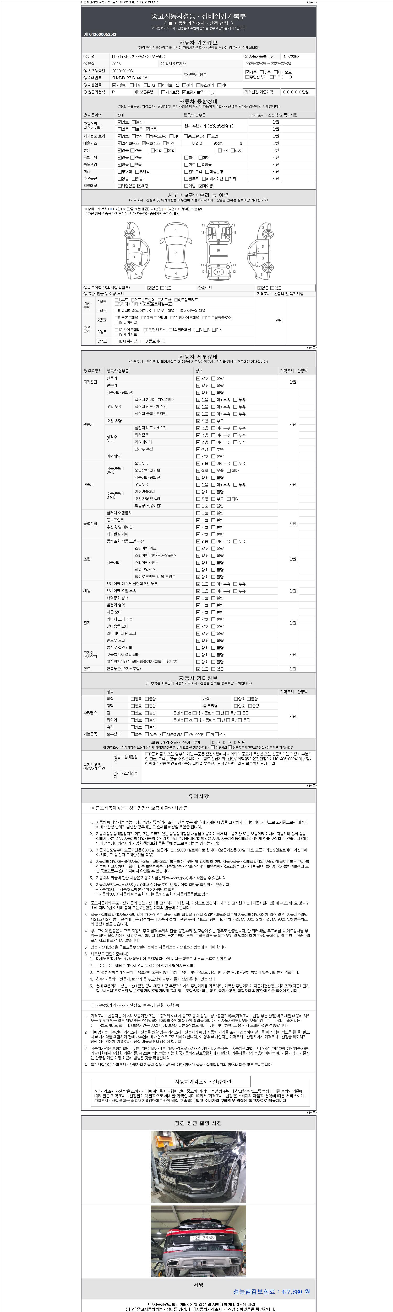 | 주행거리 | 53,555 km | 차량번호 | 12로2858 | 사고유무 | 성능기록부 참조 | 제시번호 | 제 2147483647 호 |
