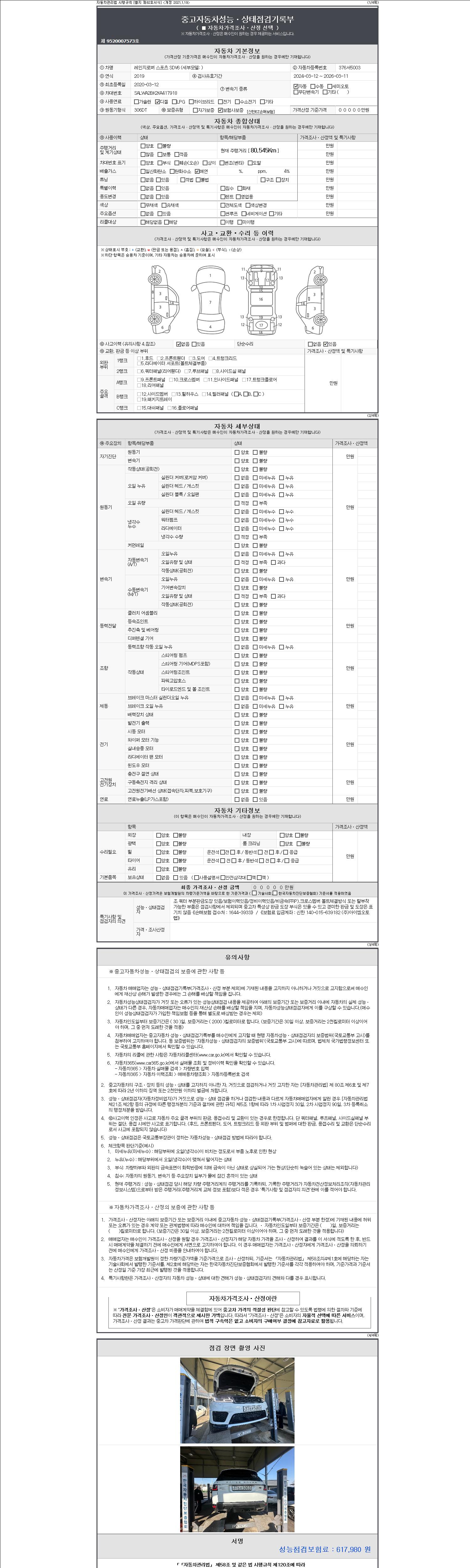 자동차관리법 시행규칙 제120조의 규정에 따라 별지 제 82호서식 《중고자동차 성능, 상태점검 기록부》를 발행한 성능, 상태점검자 및 매매자는 아래의 보증기간 또는 보증거리 이내의 중고자동차, 성능점검 기록부에 기재된 내용과 자동차의 실제 성능, 상태가 다른 경우 계약 또는 관계법령에 따라 매수인에 대하여 책임을 집니다.