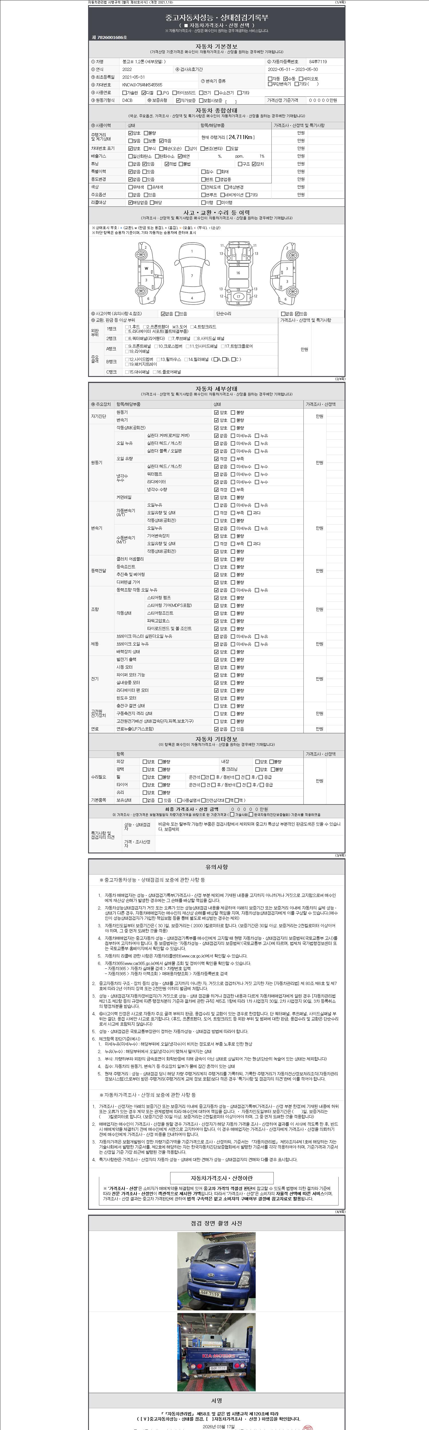자동차관리법 시행규칙 제120조의 규정에 따라 별지 제 82호서식 《중고자동차 성능, 상태점검 기록부》를 발행한 성능, 상태점검자 및 매매자는 아래의 보증기간 또는 보증거리 이내의 중고자동차, 성능점검 기록부에 기재된 내용과 자동차의 실제 성능, 상태가 다른 경우 계약 또는 관계법령에 따라 매수인에 대하여 책임을 집니다.
