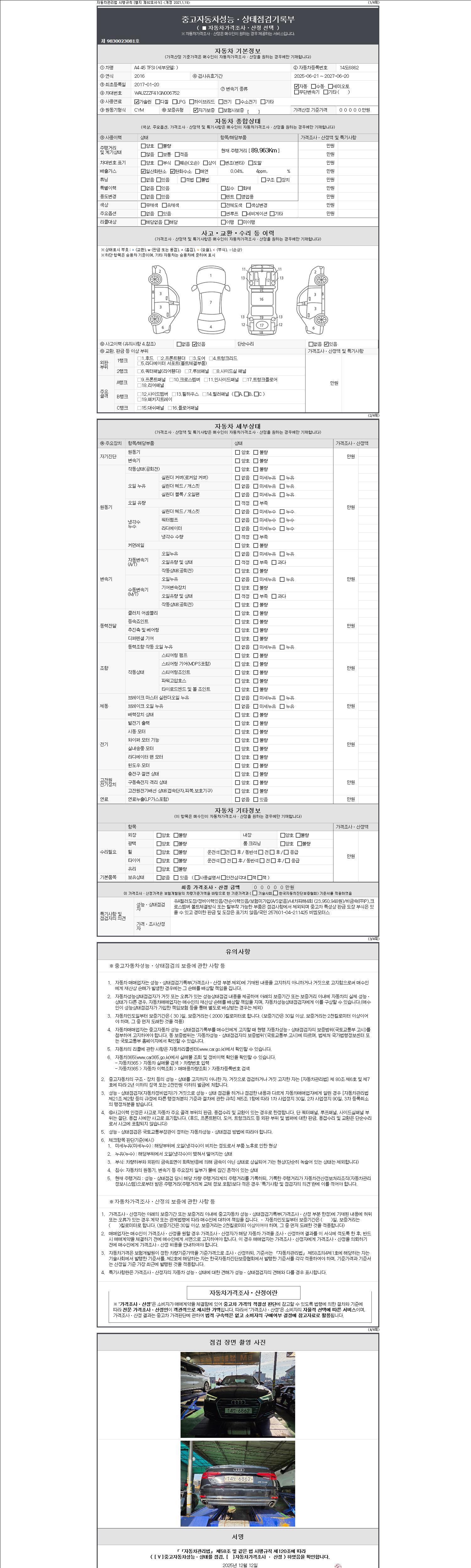 -중고자동차 매매업자를 통해 차량을 구입하실 경우 반드시 "중고자동차 성능, 상태점검 기록부"를 교뷰 받으셔야 하며, 매매업자는 반드시 의무 교부 하여야 압니다.