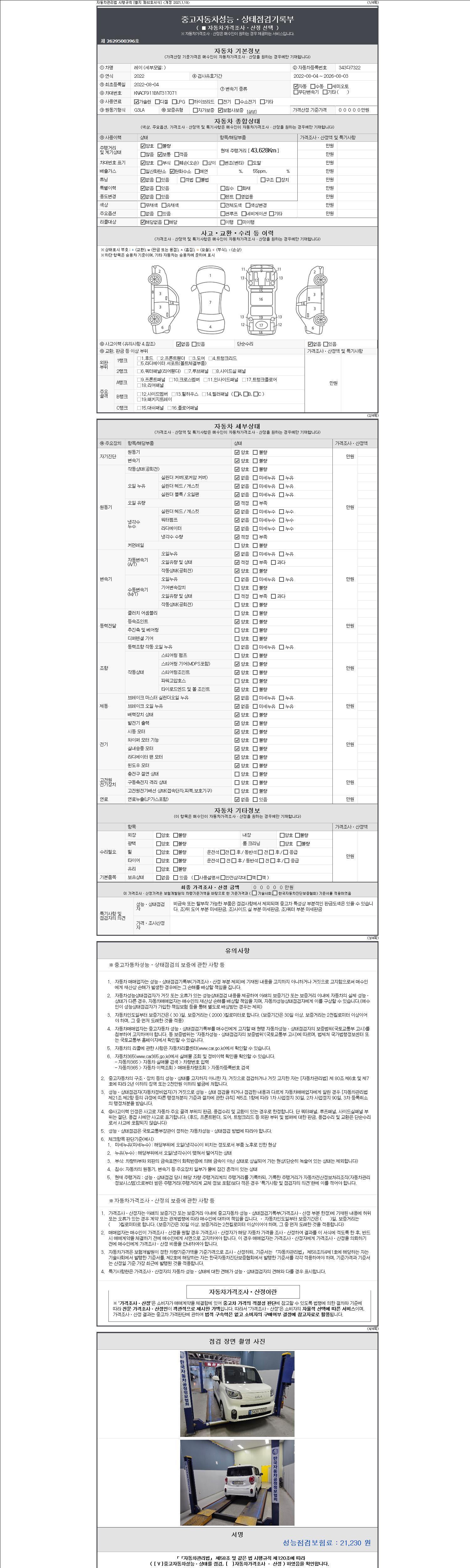 자동차관리법 시행규칙 제120조의 규정에 따라 별지 제 82호서식 《중고자동차 성능, 상태점검 기록부》를 발행한 성능, 상태점검자 및 매매자는 아래의 보증기간 또는 보증거리 이내의 중고자동차, 성능점검 기록부에 기재된 내용과 자동차의 실제 성능, 상태가 다른 경우 계약 또는 관계법령에 따라 매수인에 대하여 책임을 집니다.