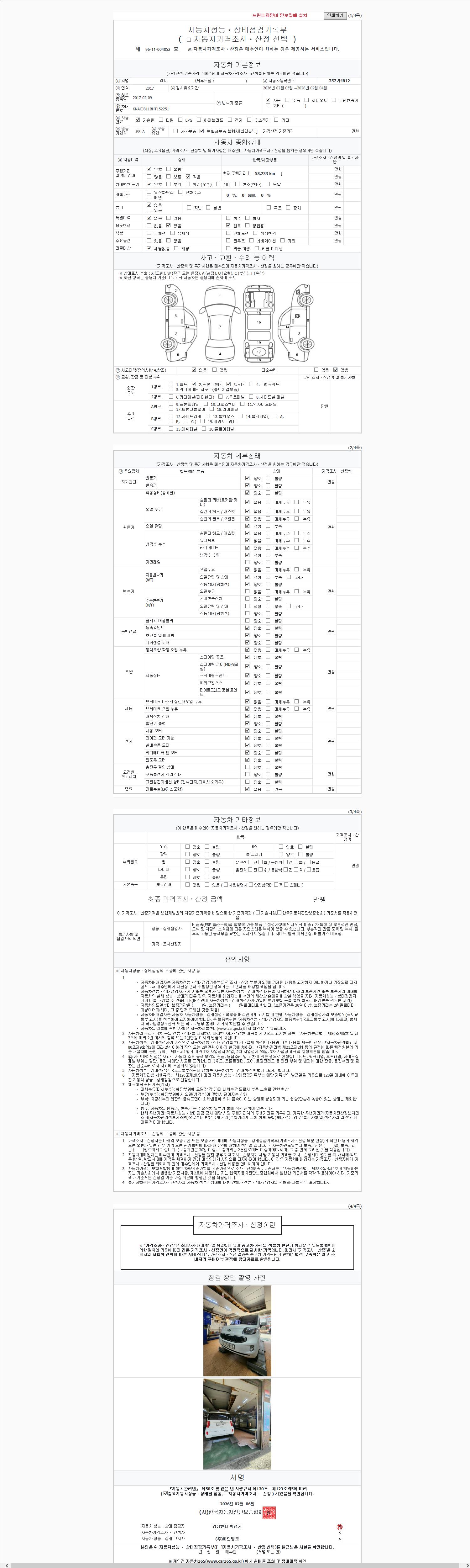 주행거리 58,233 km 차량번호 357거4812 사고유무 성능기록부 참조 제시번호 제 2026016155 호