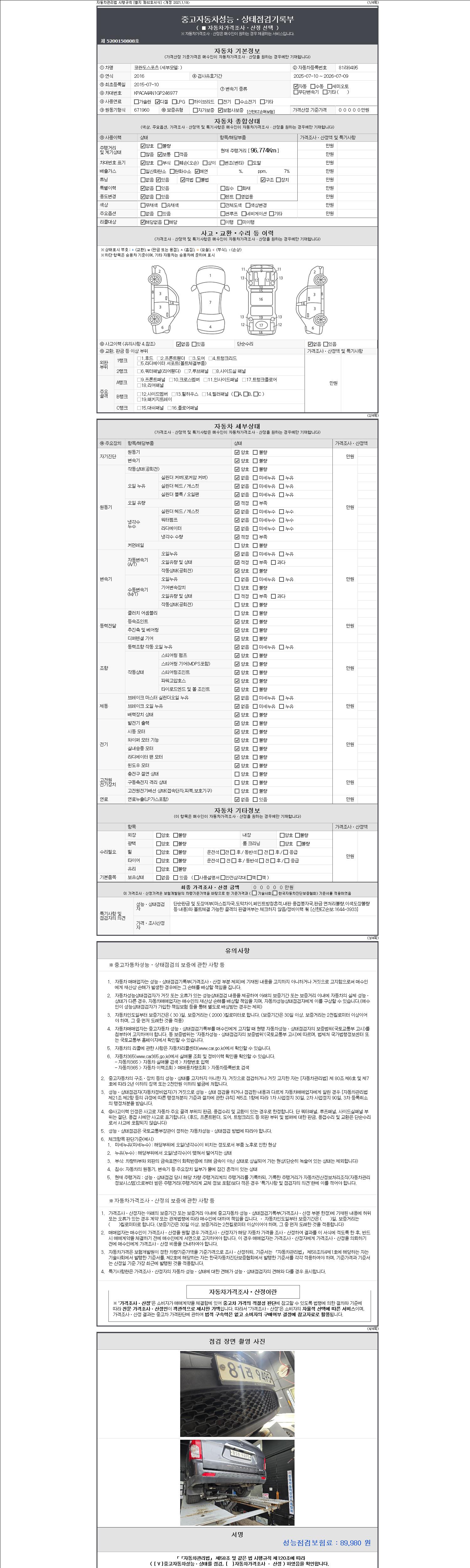 | 주행거리 | 96,774 km | 차량번호 | 81라9495 | 사고유무 | 성능기록부 참조 | 제시번호 | 제 2147483647 호 |