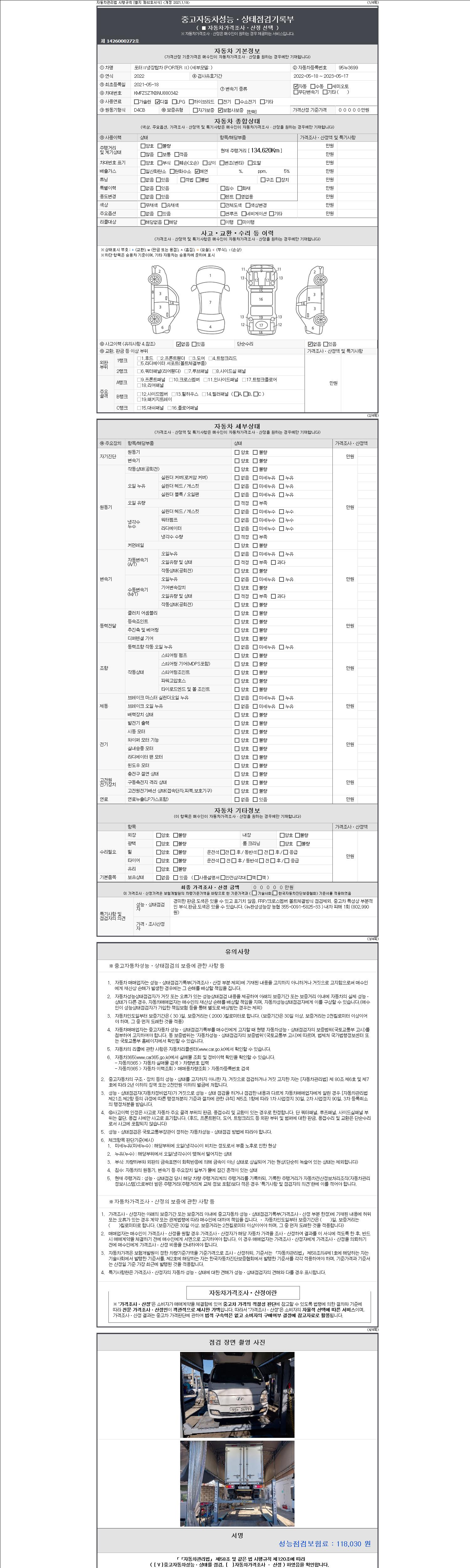 자동차관리법 시행규칙 제120조의 규정에 따라 별지 제 82호서식 《중고자동차 성능, 상태점검 기록부》를 발행한 성능, 상태점검자 및 매매자는 아래의 보증기간 또는 보증거리 이내의 중고자동차, 성능점검 기록부에 기재된 내용과 자동차의 실제 성능, 상태가 다른 경우 계약 또는 관계법령에 따라 매수인에 대하여 책임을 집니다.