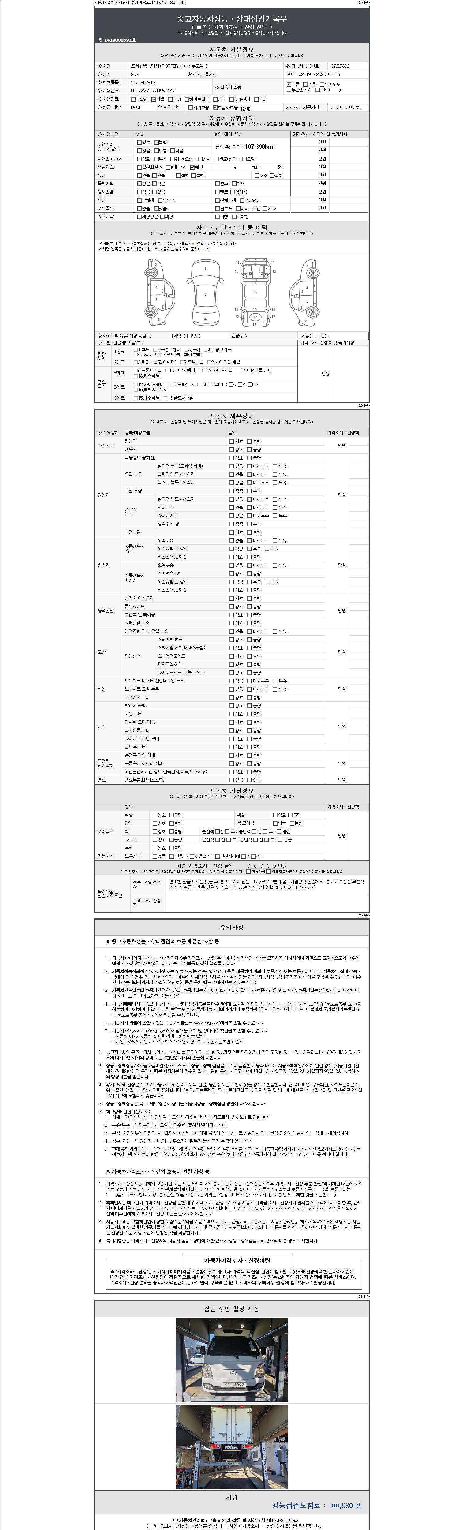 | 주행거리 | 107,392 km | 차량번호 | 97도5892 | 사고유무 | 성능기록부 참조 | 제시번호 | 제 2147483647 호 |