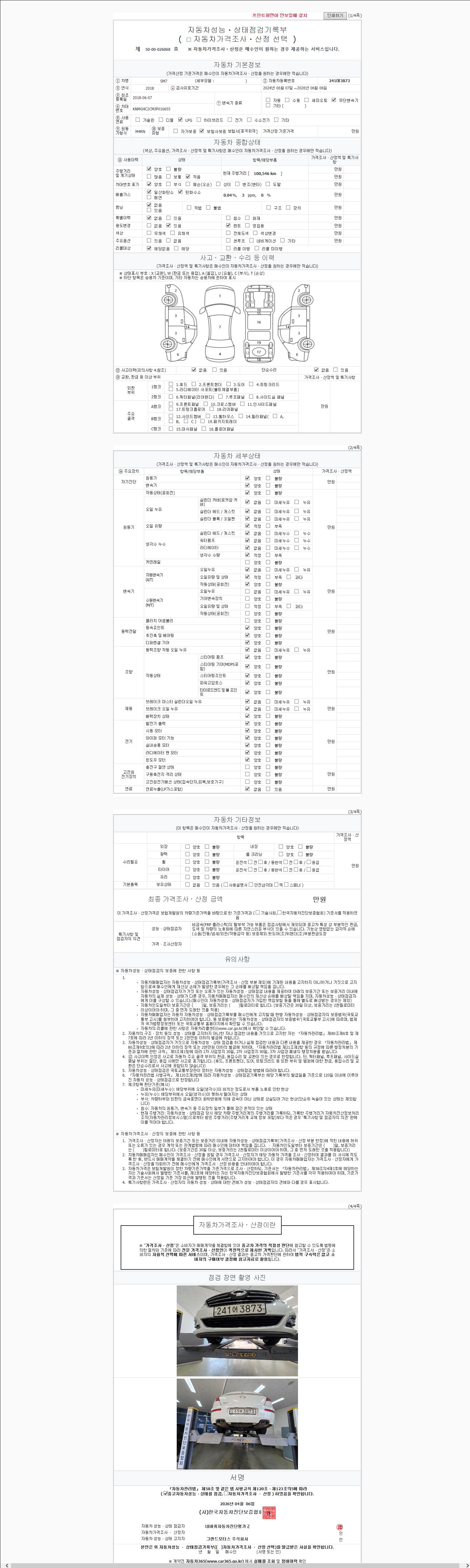 | 주행거리 | 100,546 km | 차량번호 | 241어3873 | 사고유무 | 성능기록부 참조 | 제시번호 | 제 2147483647 호 |