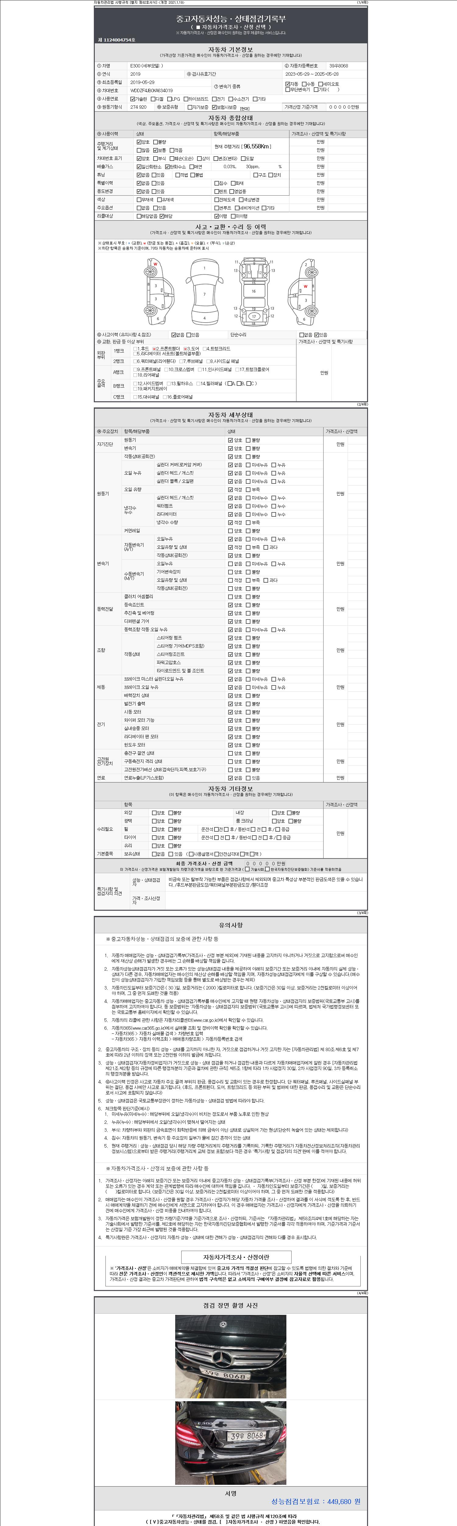 자동차관리법 시행규칙 제120조의 규정에 따라 별지 제 82호서식 《중고자동차 성능, 상태점검 기록부》를 발행한 성능, 상태점검자 및 매매자는 아래의 보증기간 또는 보증거리 이내의 중고자동차, 성능점검 기록부에 기재된 내용과 자동차의 실제 성능, 상태가 다른 경우 계약 또는 관계법령에 따라 매수인에 대하여 책임을 집니다.