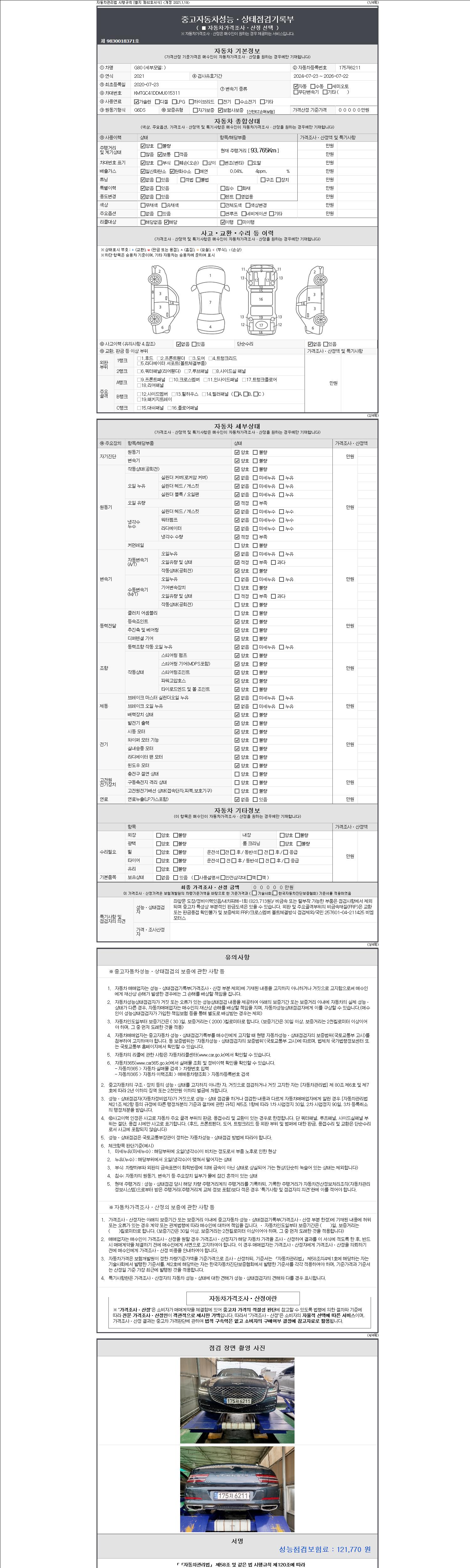 | 주행거리 | 93,765 km | 차량번호 | 175저6211 | 사고유무 | 성능기록부 참조 | 제시번호 | 제 2147483647 호 |