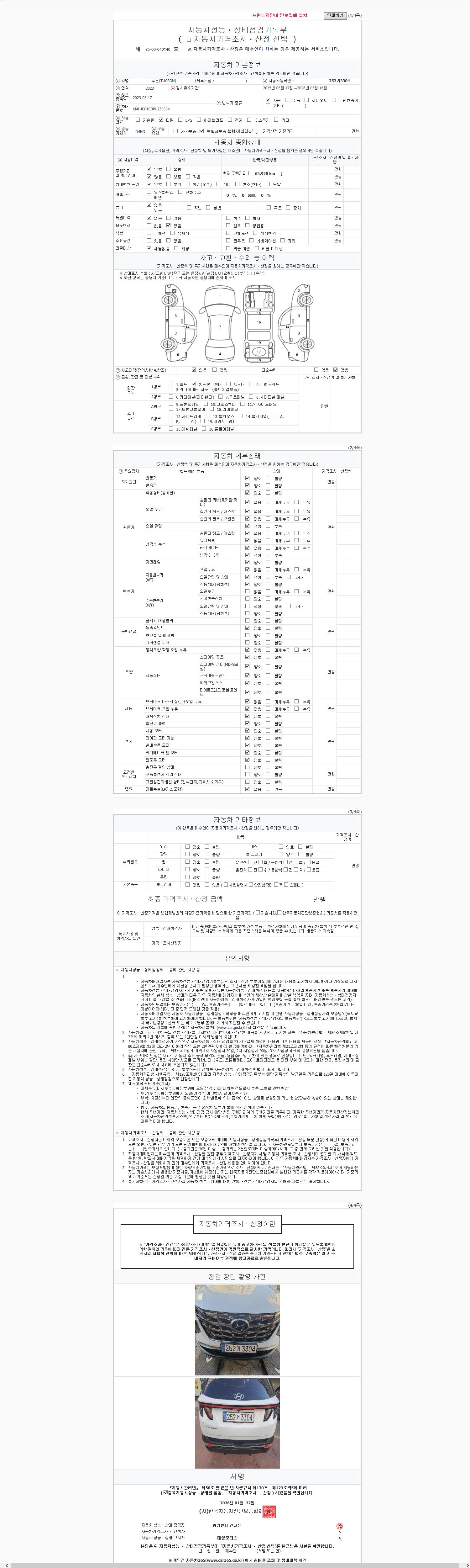 | 주행거리 | 65,897 km | 차량번호 | 252거3304 | 사고유무 | 성능기록부 참조 | 제시번호 | 제 2147483647 호 |