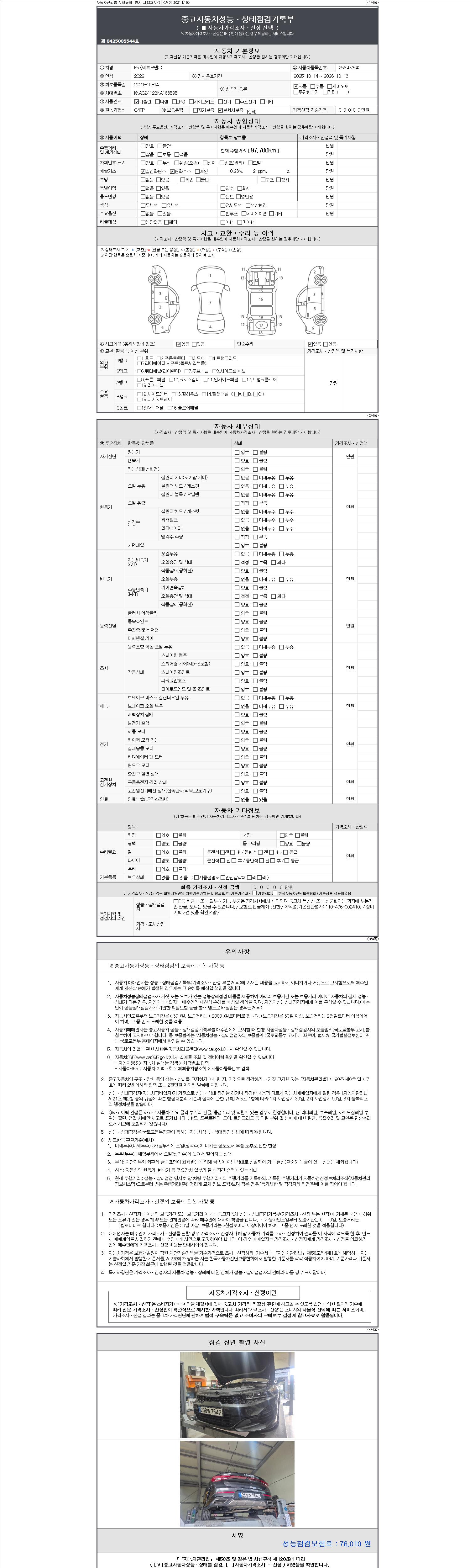 | 주행거리 | 97,576 km | 차량번호 | 258마7542 | 사고유무 | 성능기록부 참조 | 제시번호 | 제 2147483647 호 |