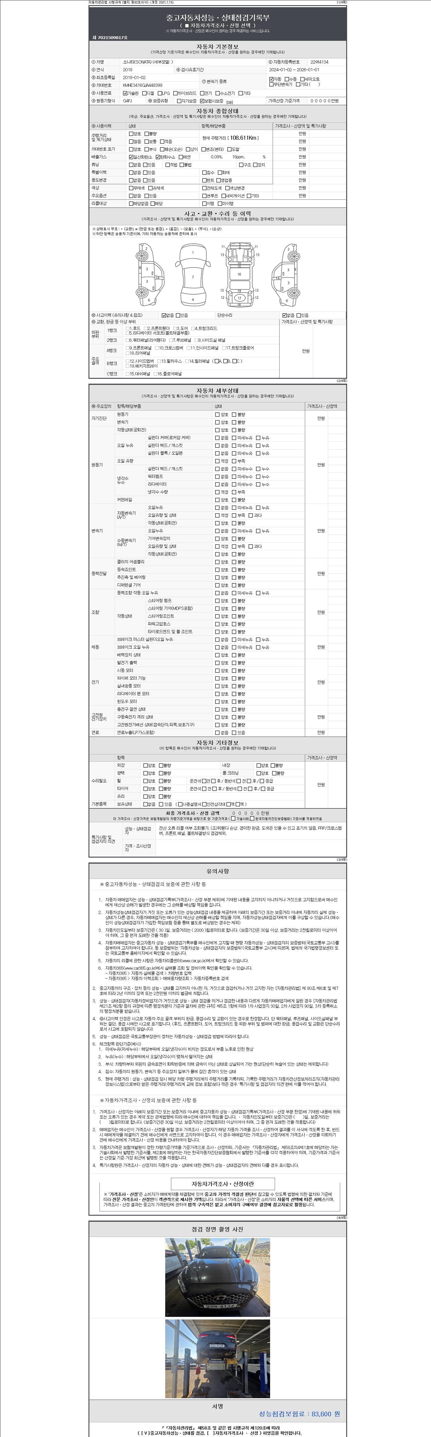 | 주행거리 | 108,611 km | 차량번호 | 22머4134 | 사고유무 | 성능기록부 참조 | 제시번호 | 제 2147483647 호 |