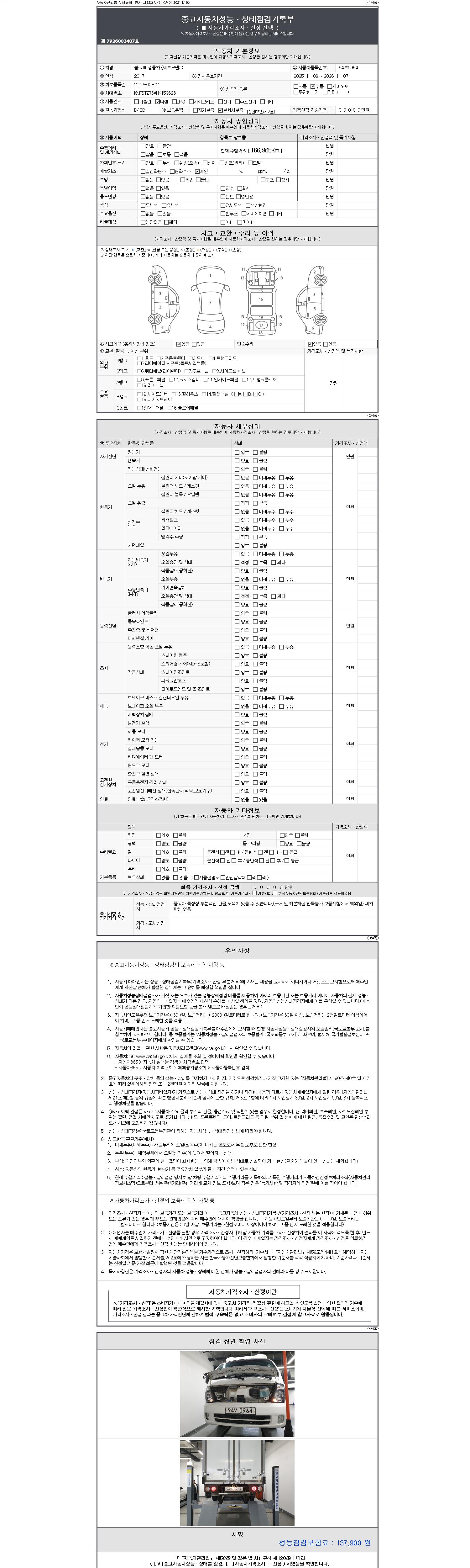 | 주행거리 | 166,954 km | 차량번호 | 94부0964 | 사고유무 | 성능기록부 참조 | 제시번호 | 제 2147483647 호 |
