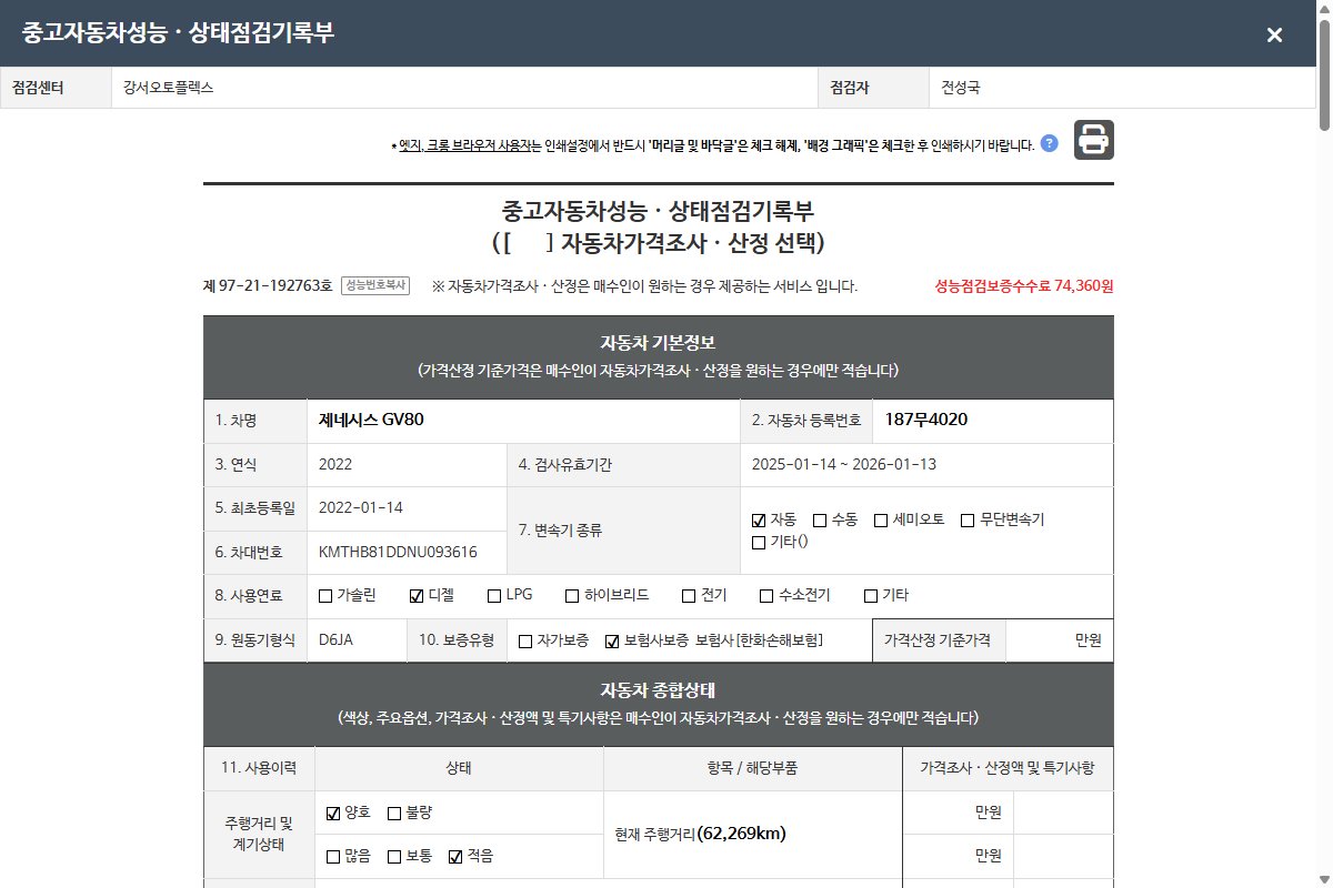 | 주행거리 | 62,269 km | 차량번호 | 187무4020 | 사고유무 | 성능기록부 참조 | 제시번호 | 제 2025139527 호 |