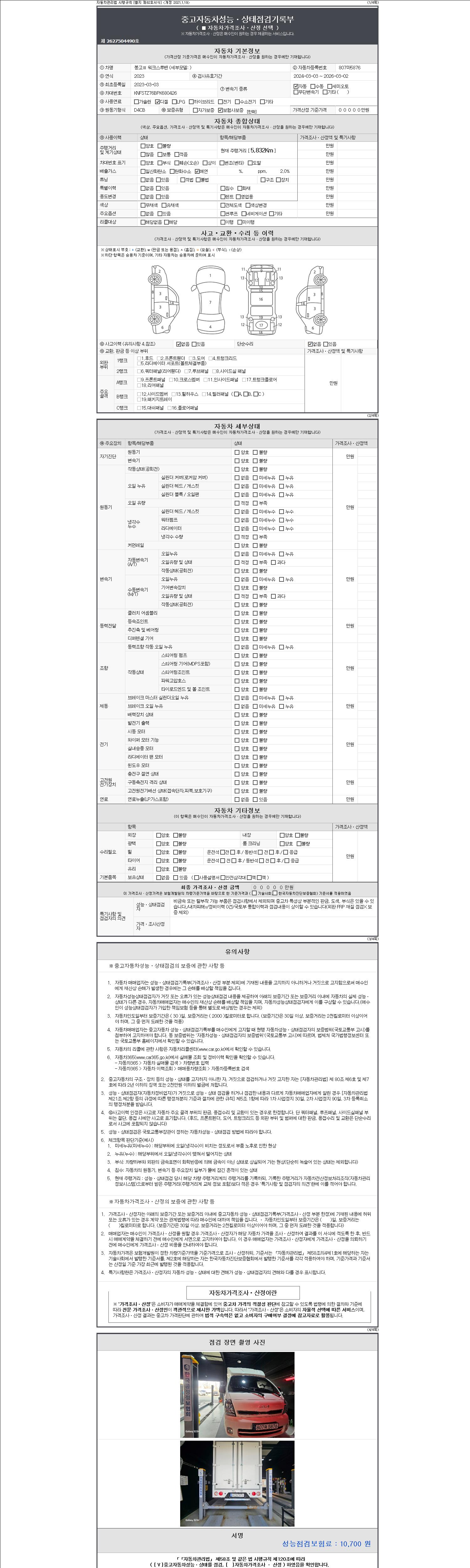 자동차관리법 시행규칙 제120조의 규정에 따라 별지 제 82호서식 《중고자동차 성능, 상태점검 기록부》를 발행한 성능, 상태점검자 및 매매자는 아래의 보증기간 또는 보증거리 이내의 중고자동차, 성능점검 기록부에 기재된 내용과 자동차의 실제 성능, 상태가 다른 경우 계약 또는 관계법령에 따라 매수인에 대하여 책임을 집니다.