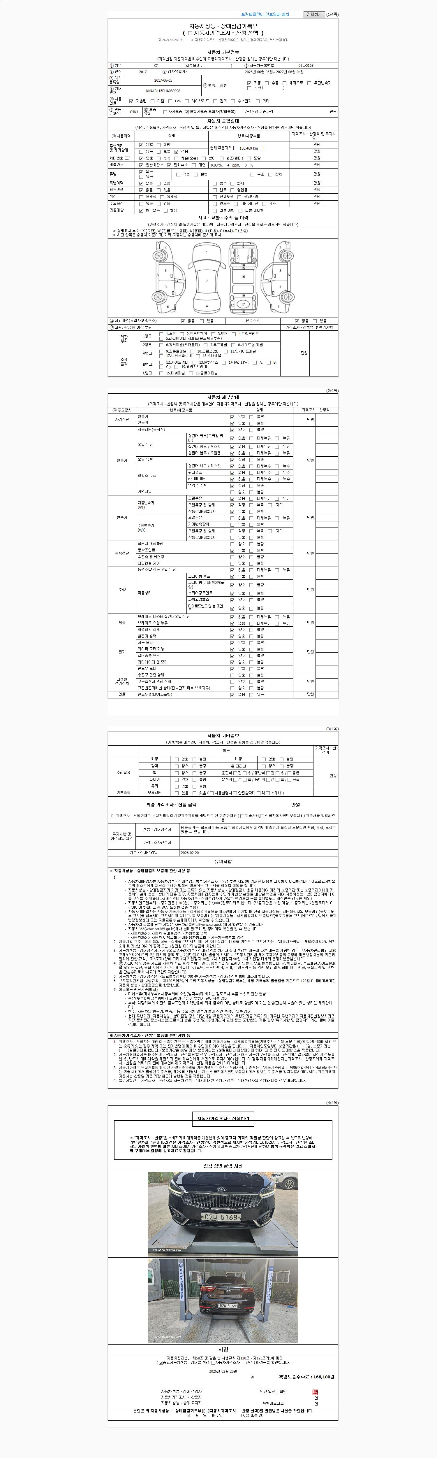 | 주행거리 | 150,469 km | 차량번호 | 02나5168 | 사고유무 | 성능기록부 참조 | 제시번호 | 제 2026008620 호 |
