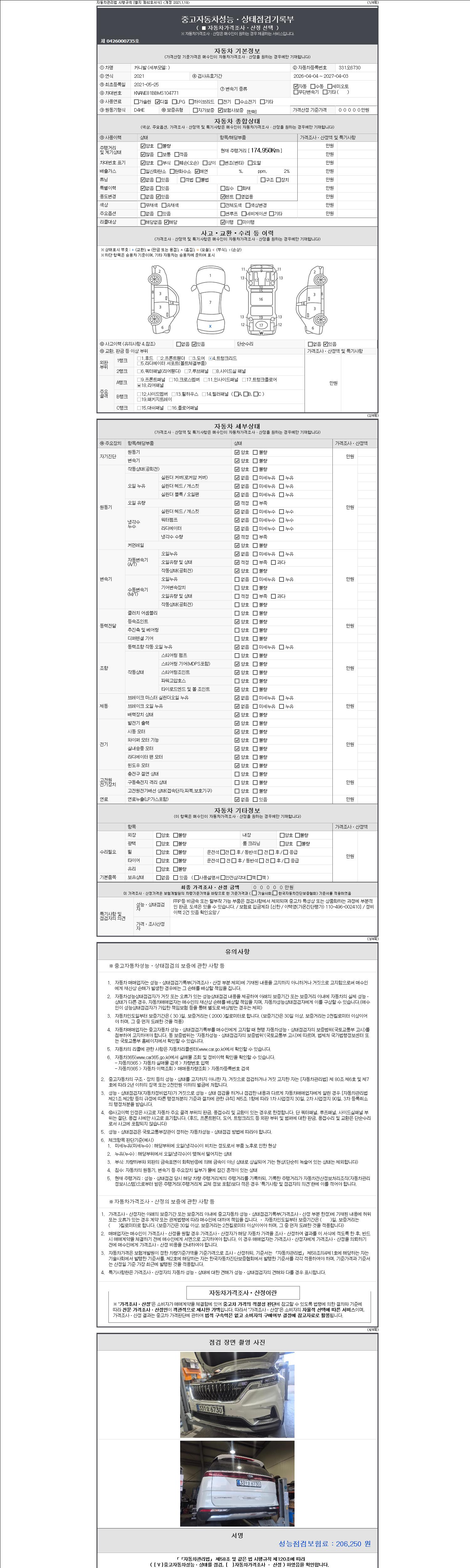 자동차관리법 시행규칙 제120조의 규정에 따라 별지 제 82호서식 《중고자동차 성능, 상태점검 기록부》를 발행한 성능, 상태점검자 및 매매자는 아래의 보증기간 또는 보증거리 이내의 중고자동차, 성능점검 기록부에 기재된 내용과 자동차의 실제 성능, 상태가 다른 경우 계약 또는 관계법령에 따라 매수인에 대하여 책임을 집니다.