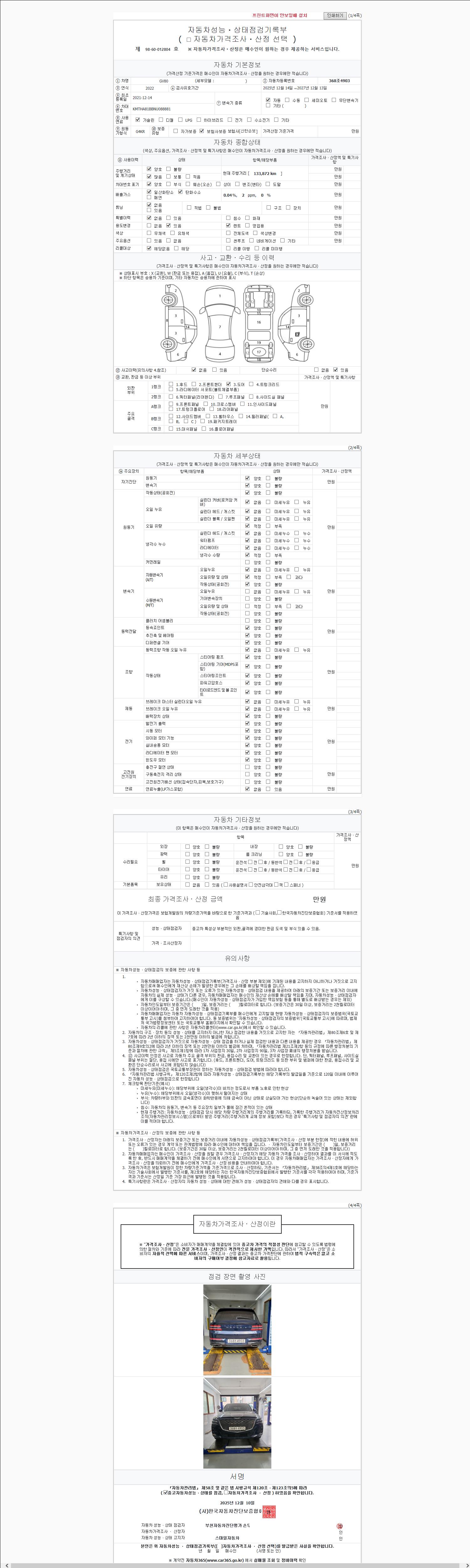 | 주행거리 | 133,797 km | 차량번호 | 368조4903 | 사고유무 | 성능기록부 참조 | 제시번호 | 제 2025228655 호 |