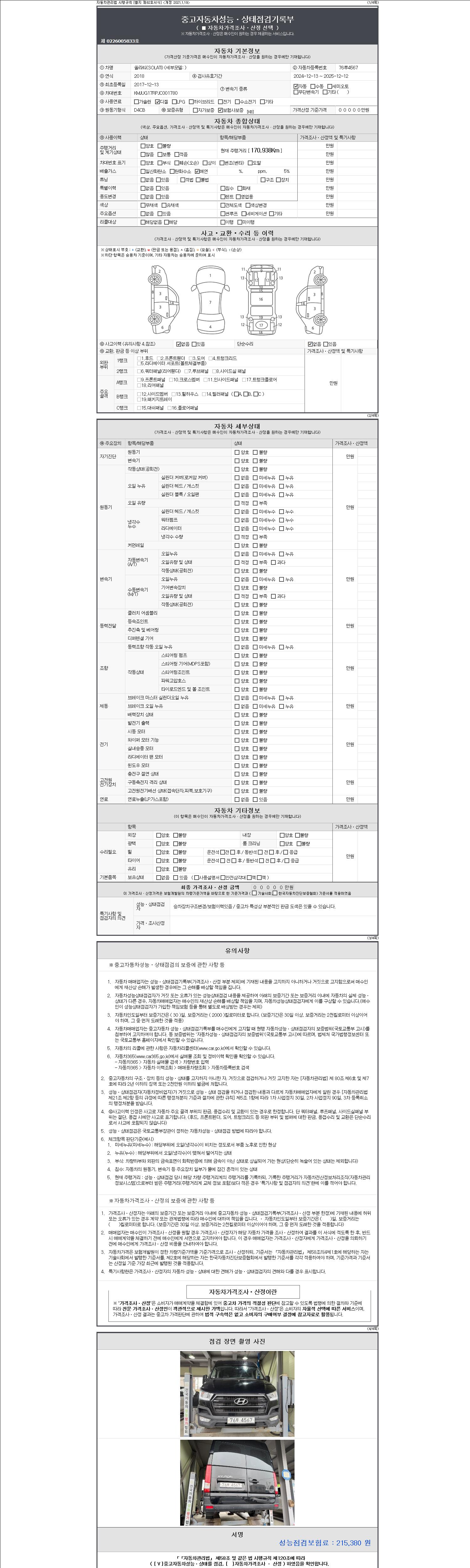 | 주행거리 | 170,938 km | 차량번호 | 76루4567 | 사고유무 | 성능기록부 참조 | 제시번호 | 제 2147483647 호 |