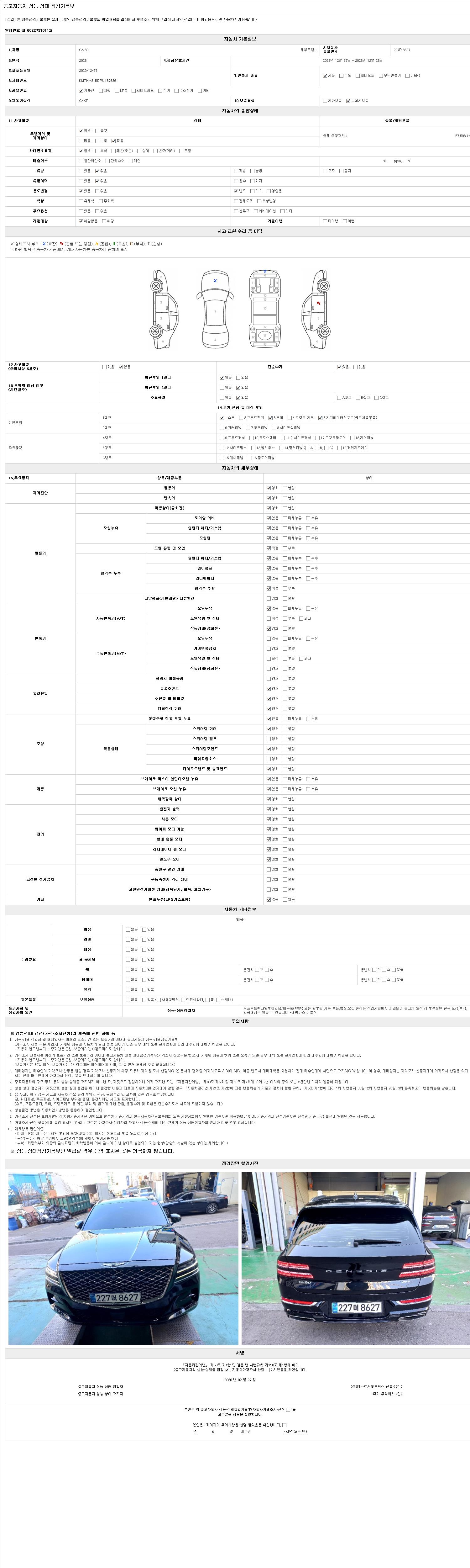 | 주행거리 | 57,598 km | 차량번호 | 227머8627 | 사고유무 | 성능기록부 참조 | 제시번호 | 제 2026006888 호 |