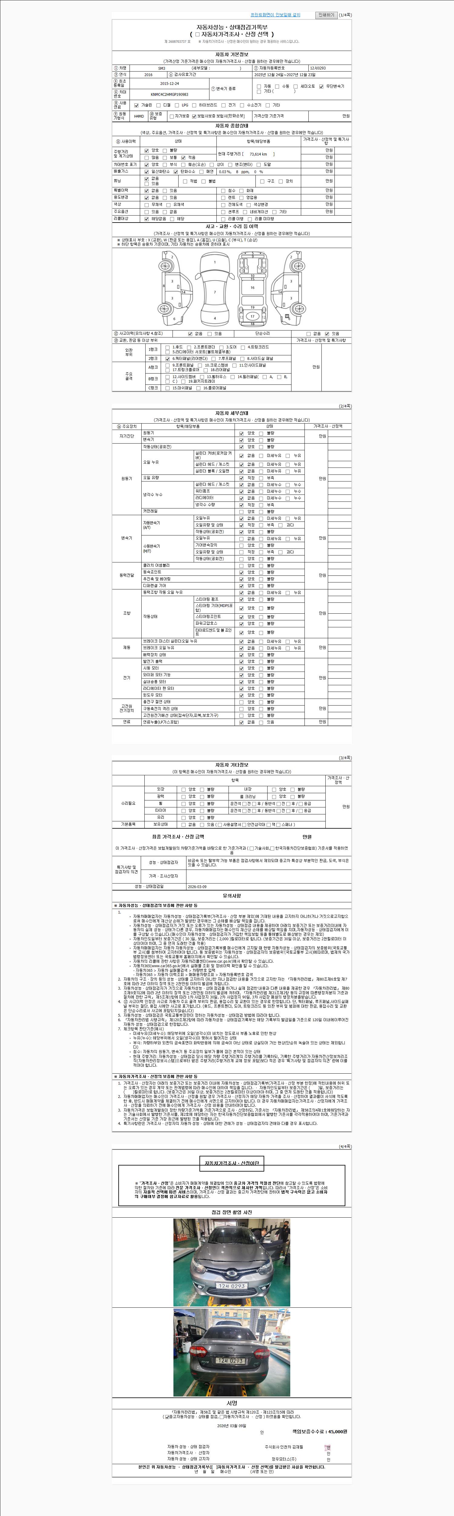 | 주행거리 | 73,614 km | 차량번호 | 12서0293 | 사고유무 | 성능기록부 참조 | 제시번호 | 제 2026011749 호 |