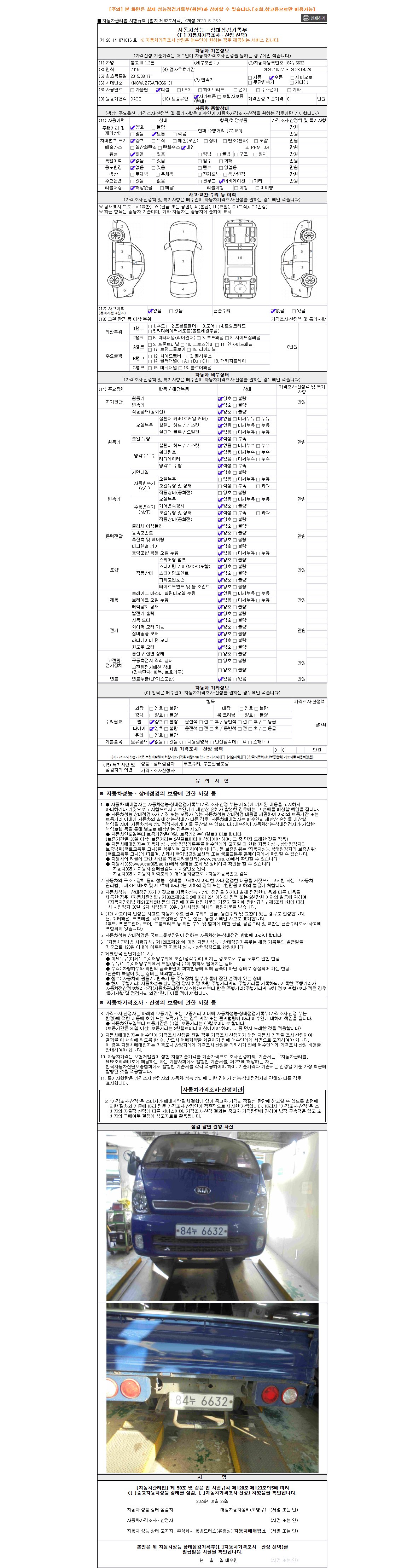 | 주행거리 | 77,160 km | 차량번호 | 84누6632 | 사고유무 | 성능기록부 참조 | 제시번호 | 제 2026008193 호 |
