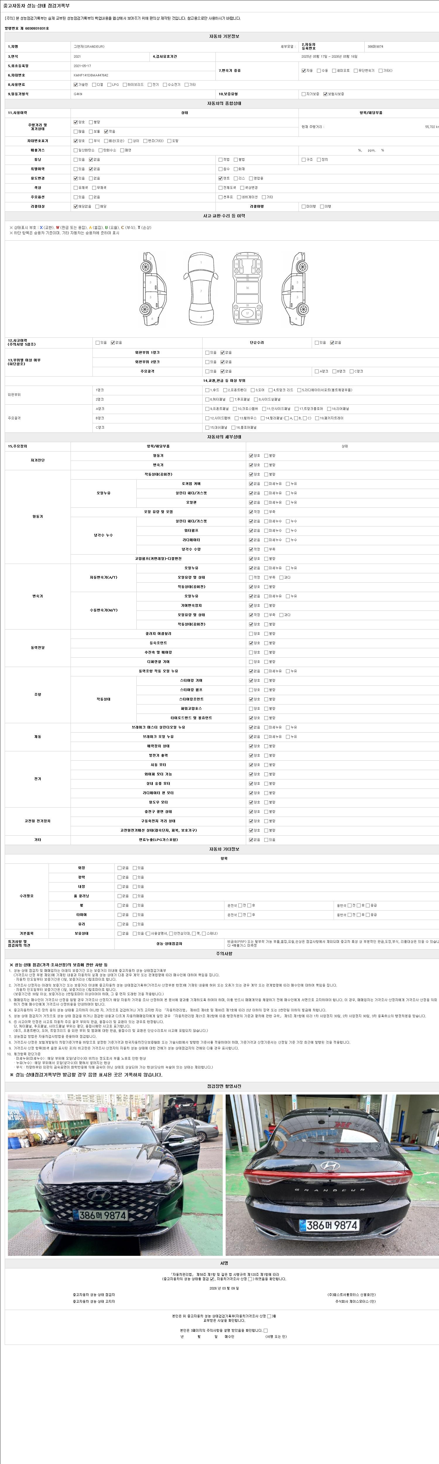 | 주행거리 | 55,722 km | 차량번호 | 386머9874 | 사고유무 | 성능기록부 참조 | 제시번호 | 제 2026007312 호 |