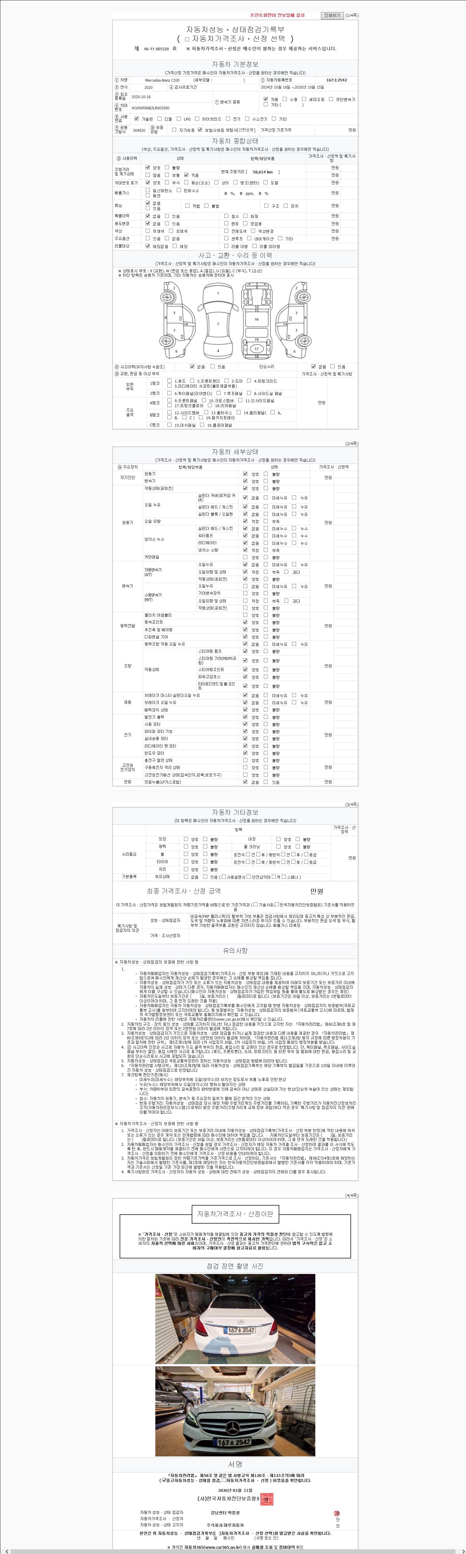 | 주행거리 | 58,614 km | 차량번호 | 167소2542 | 사고유무 | 성능기록부 참조 | 제시번호 | 제 2026031338 호 |