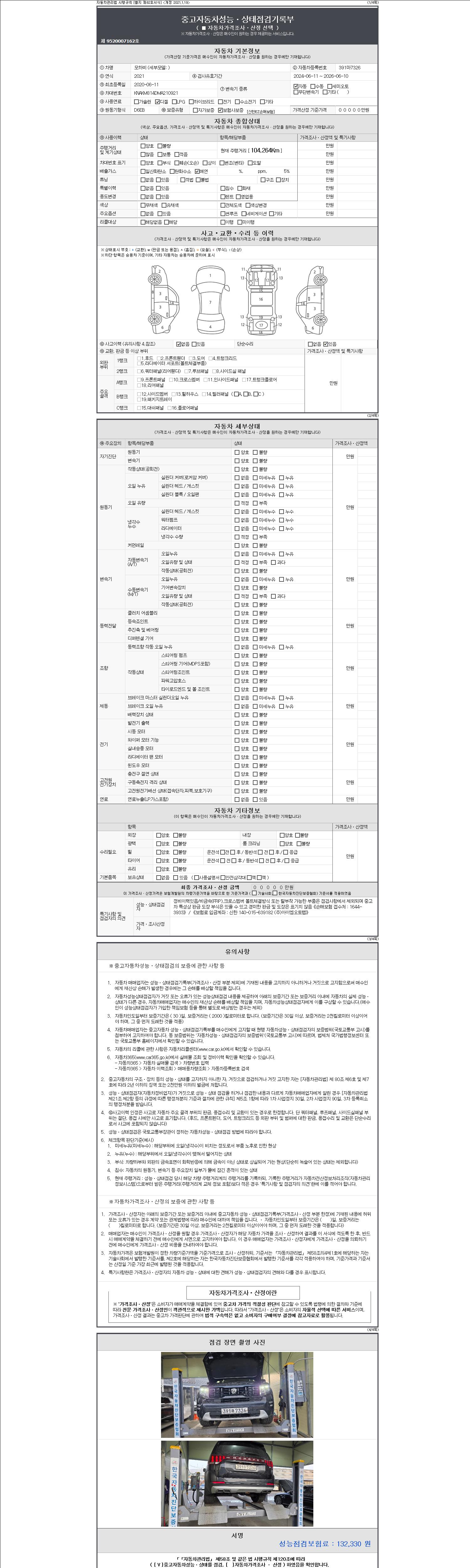 자동차관리법 시행규칙 제120조의 규정에 따라 별지 제 82호서식 《중고자동차 성능, 상태점검 기록부》를 발행한 성능, 상태점검자 및 매매자는 아래의 보증기간 또는 보증거리 이내의 중고자동차, 성능점검 기록부에 기재된 내용과 자동차의 실제 성능, 상태가 다른 경우 계약 또는 관계법령에 따라 매수인에 대하여 책임을 집니다.