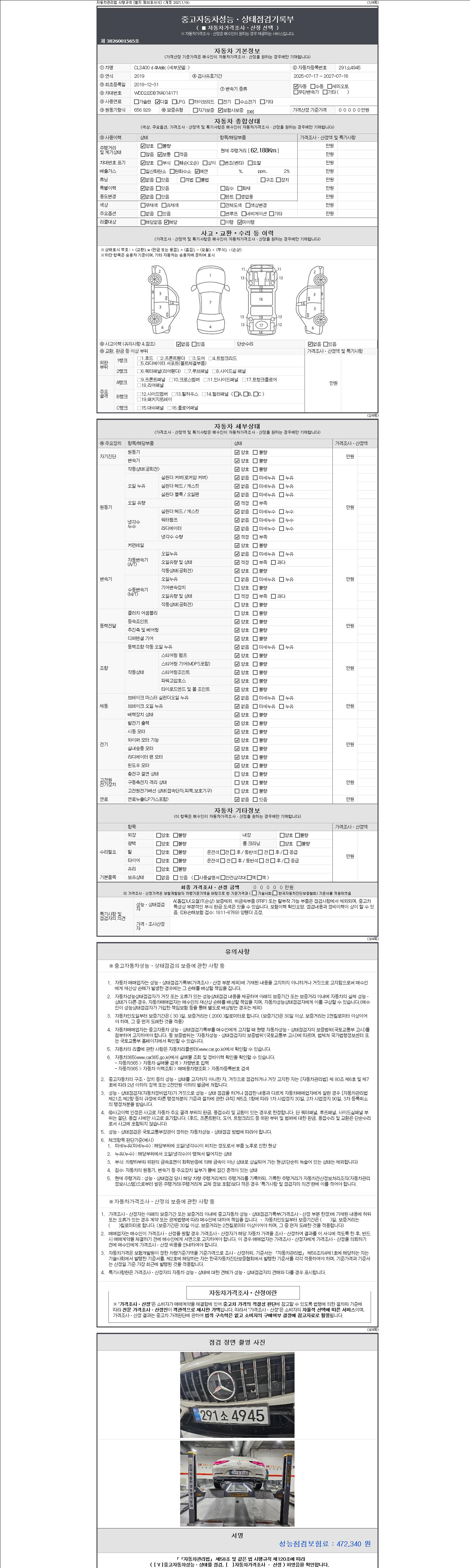 | 주행거리 | 62,188 km | 차량번호 | 291소4945 | 사고유무 | 성능기록부 참조 | 제시번호 | 제 2147483647 호 |