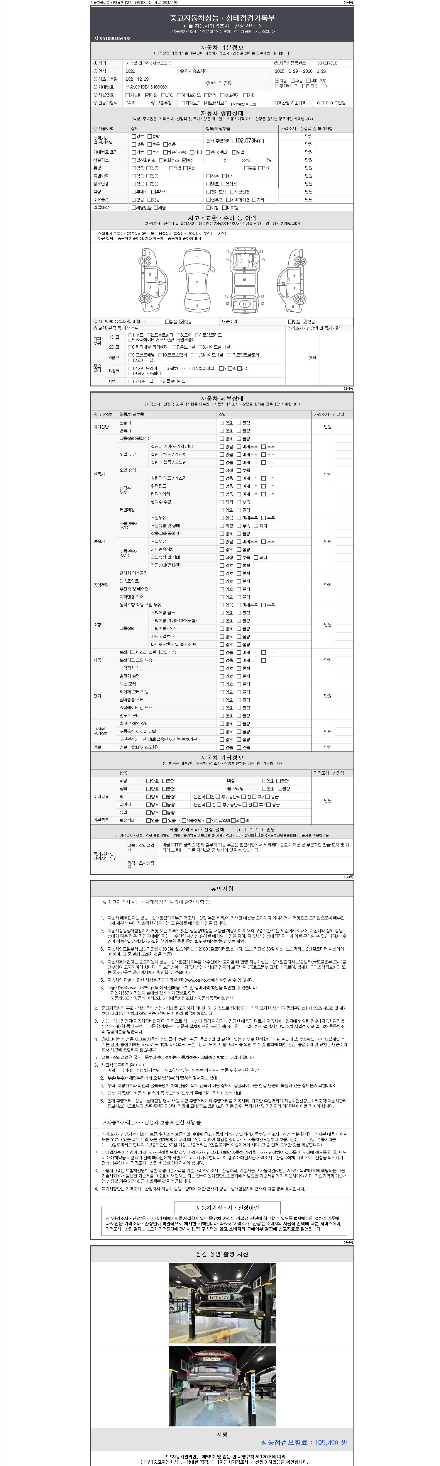 | 주행거리 | 102,073 km | 차량번호 | 387고7708 | 사고유무 | 성능기록부 참조 | 제시번호 | 제 2147483647 호 |
