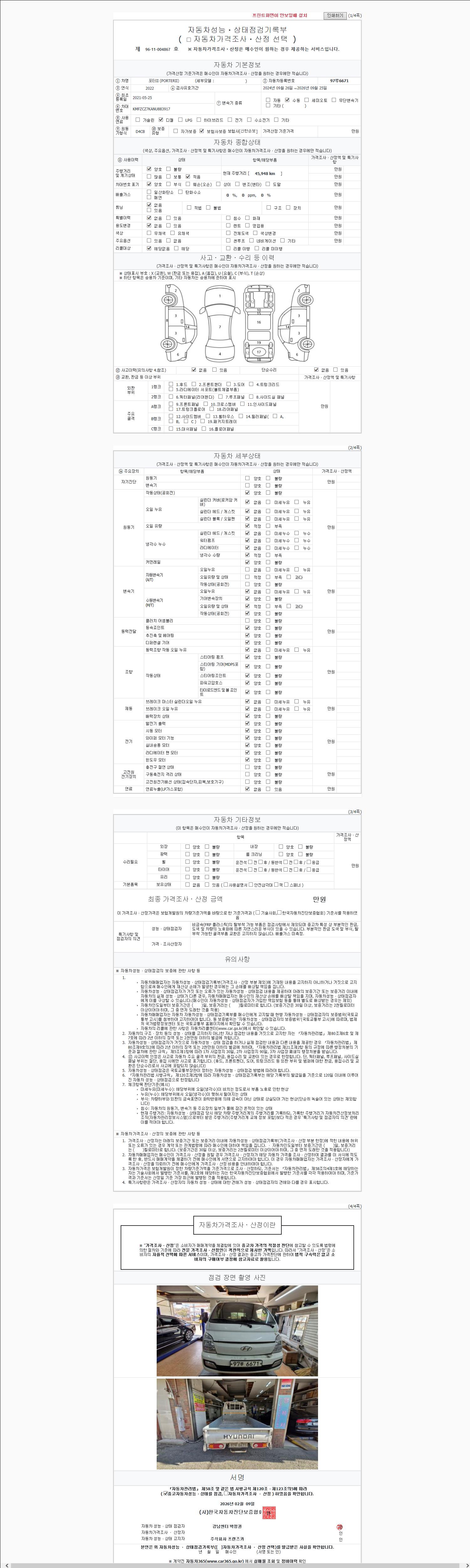 | 주행거리 | 45,994 km | 차량번호 | 97루6671 | 사고유무 | 성능기록부 참조 | 제시번호 | 제 2026017168 호 |
