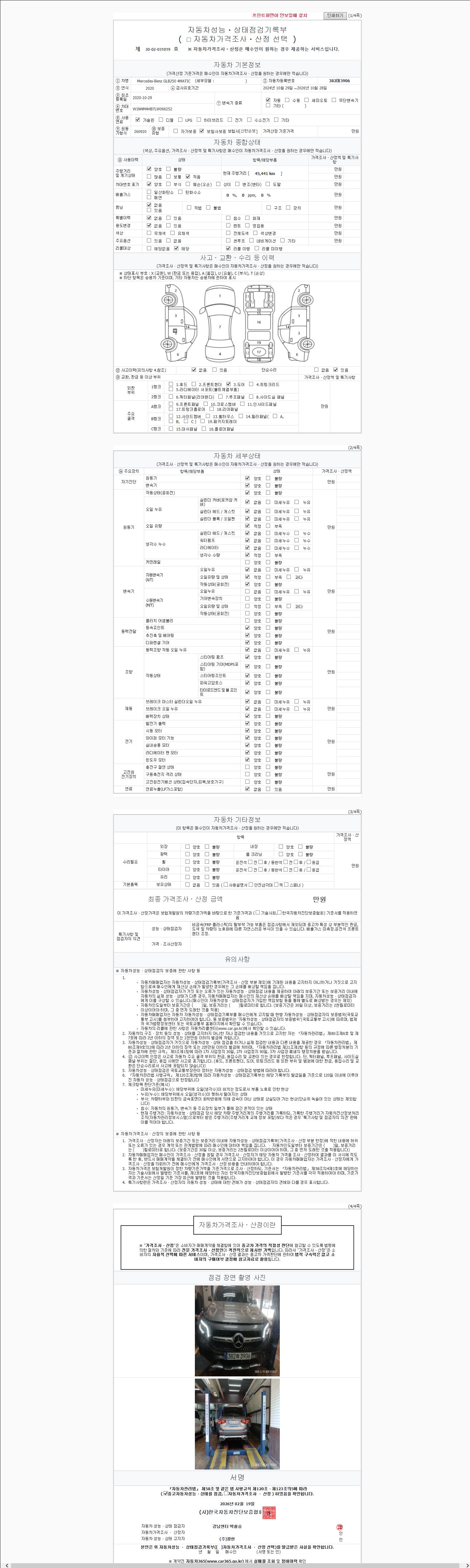 | 주행거리 | 45,441 km | 차량번호 | 382머3906 | 사고유무 | 성능기록부 참조 | 제시번호 | 제 2026021121 호 |