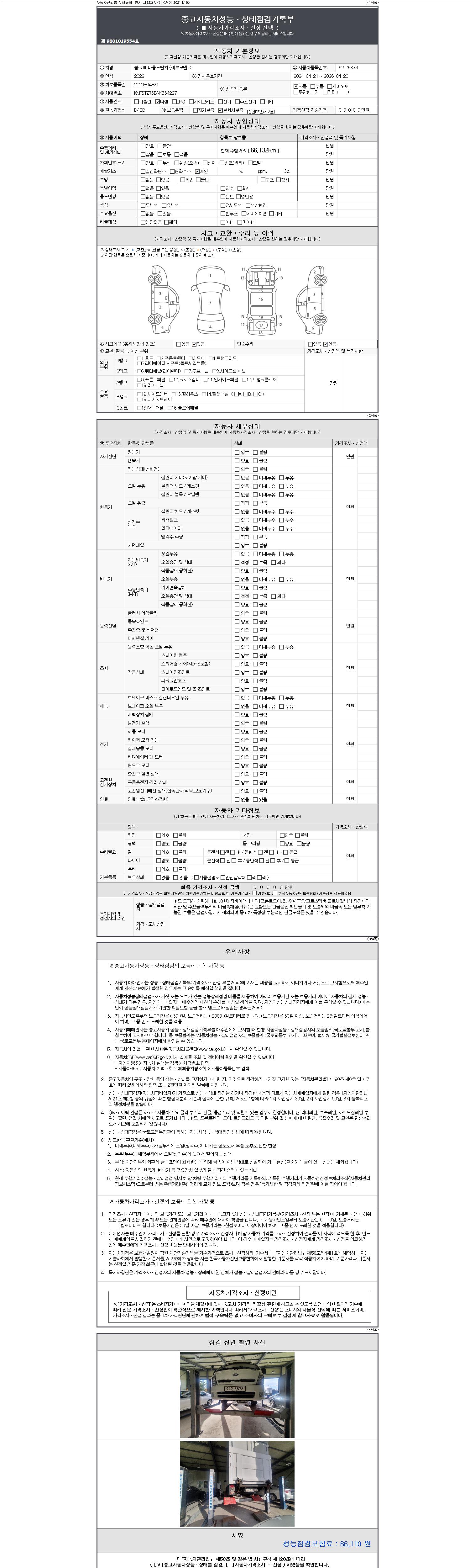 | 주행거리 | 66,132 km | 차량번호 | 92구6873 | 사고유무 | 성능기록부 참조 | 제시번호 | 제 2147483647 호 |