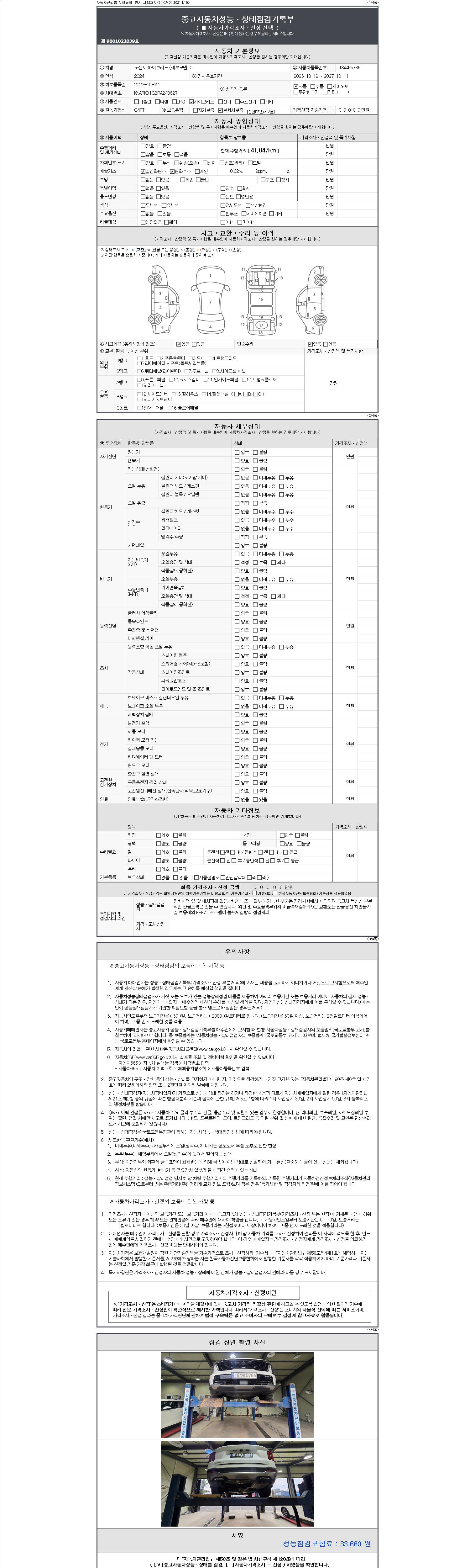 자동차관리법 시행규칙 제120조의 규정에 따라 별지 제 82호서식 《중고자동차 성능, 상태점검 기록부》를 발행한 성능, 상태점검자 및 매매자는 아래의 보증기간 또는 보증거리 이내의 중고자동차, 성능점검 기록부에 기재된 내용과 자동차의 실제 성능, 상태가 다른 경우 계약 또는 관계법령에 따라 매수인에 대하여 책임을 집니다.
