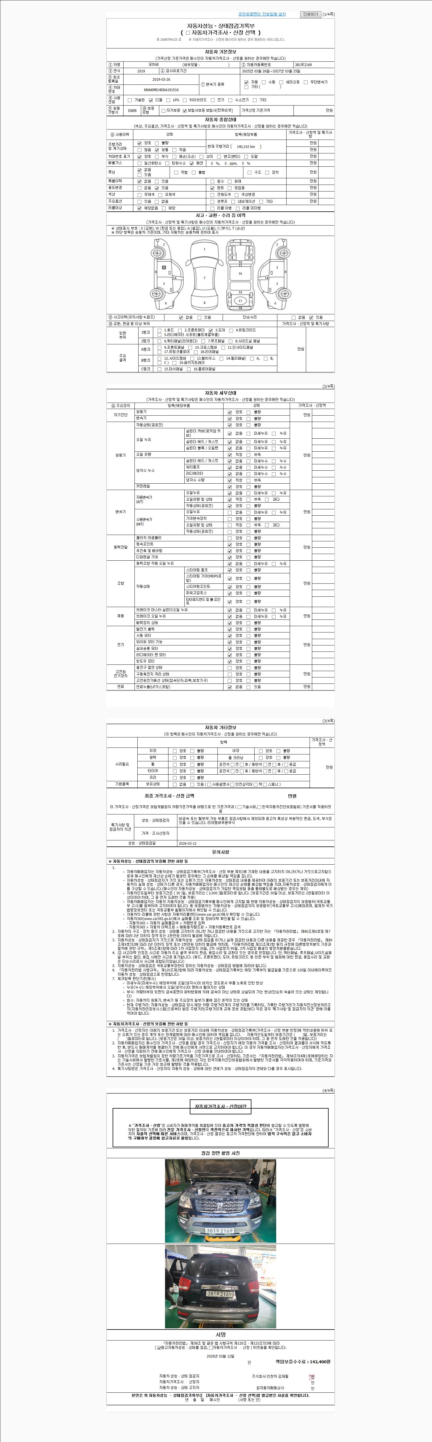 | 주행거리 | 140,310 km | 차량번호 | 381무2169 | 사고유무 | 성능기록부 참조 | 제시번호 | 제 2026012946 호 |