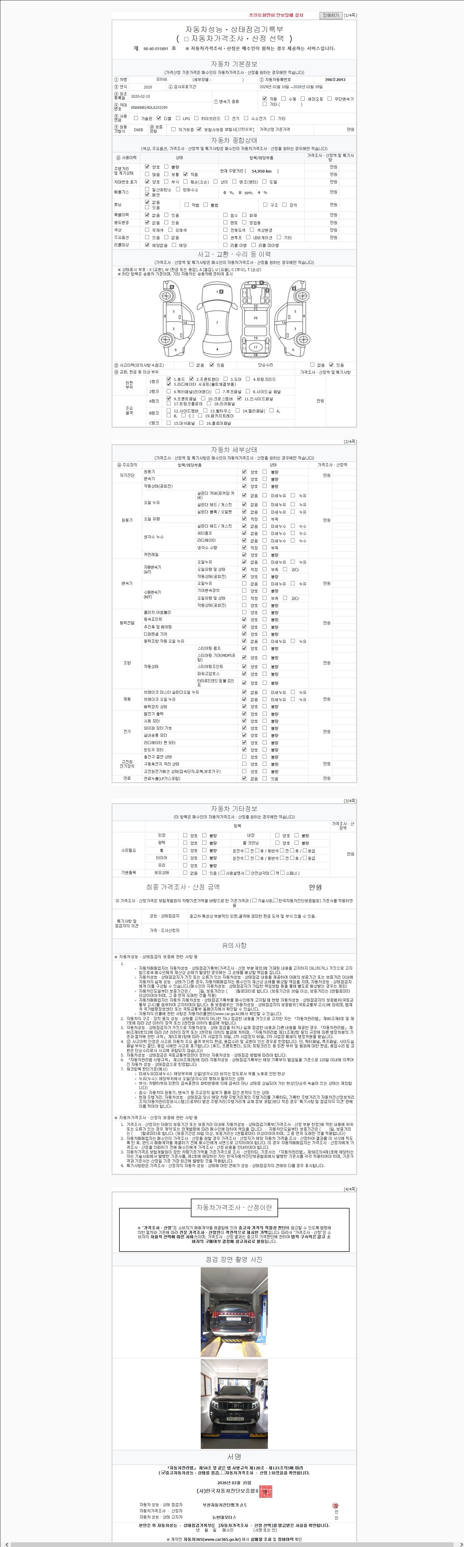 | 주행거리 | 54,950 km | 차량번호 | 396우2043 | 사고유무 | 성능기록부 참조 | 제시번호 | 제 2026005545 호 |