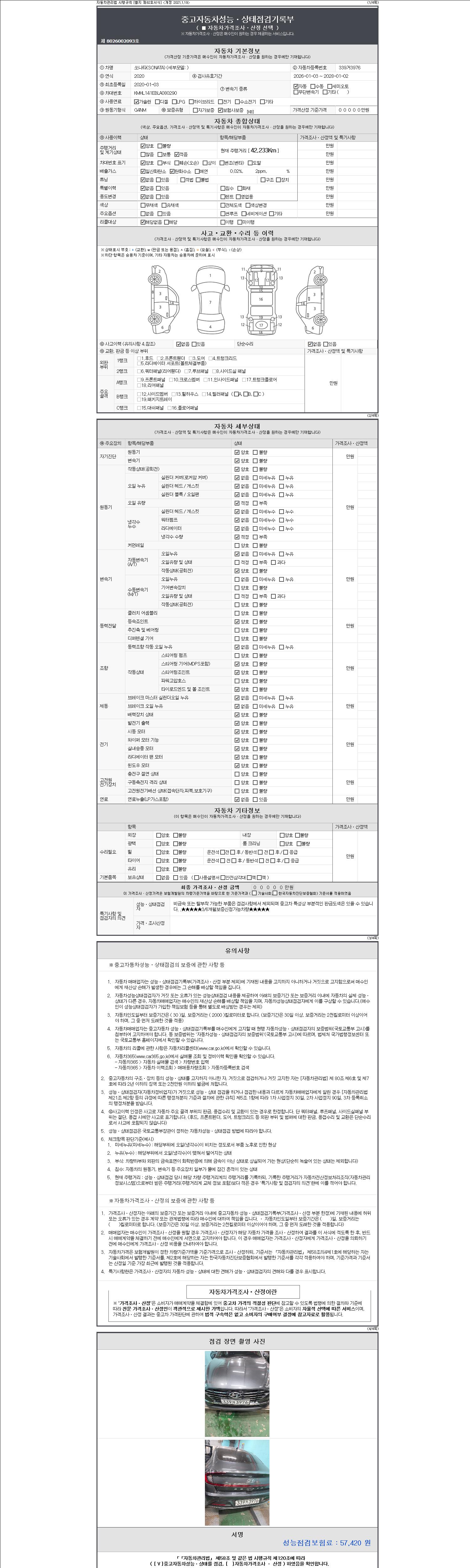 자동차관리법 시행규칙 제120조의 규정에 따라 별지 제 82호서식 《중고자동차 성능, 상태점검 기록부》를 발행한 성능, 상태점검자 및 매매자는 아래의 보증기간 또는 보증거리 이내의 중고자동차, 성능점검 기록부에 기재된 내용과 자동차의 실제 성능, 상태가 다른 경우 계약 또는 관계법령에 따라 매수인에 대하여 책임을 집니다.