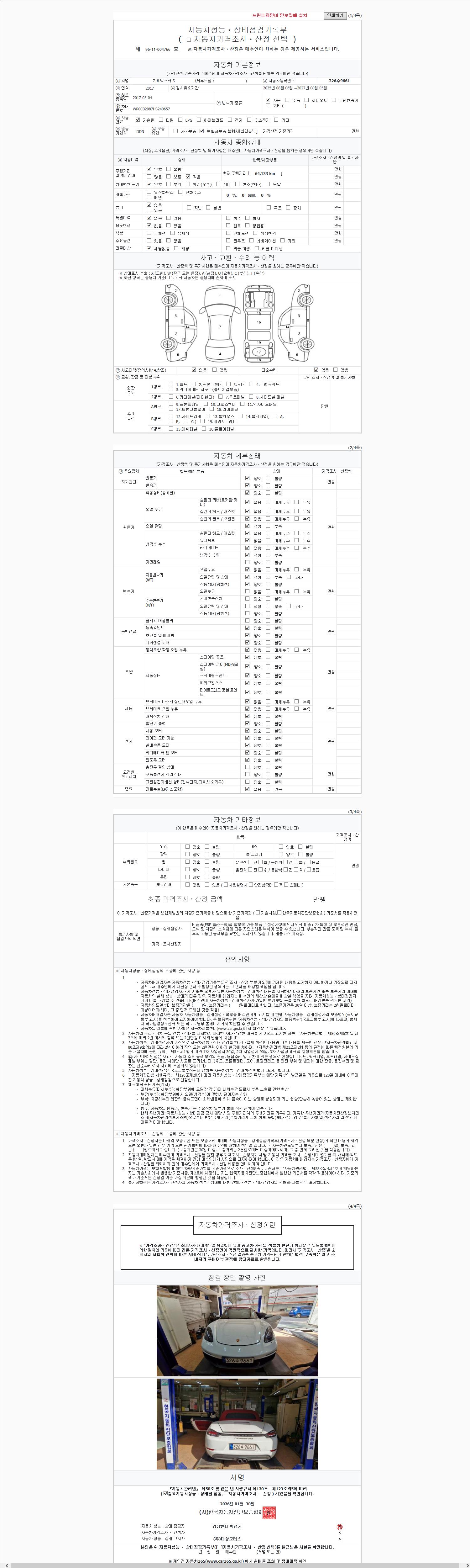 | 주행거리 | 64,133 km | 차량번호 | 326수9661 | 사고유무 | 성능기록부 참조 | 제시번호 | 제 2026017159 호 |