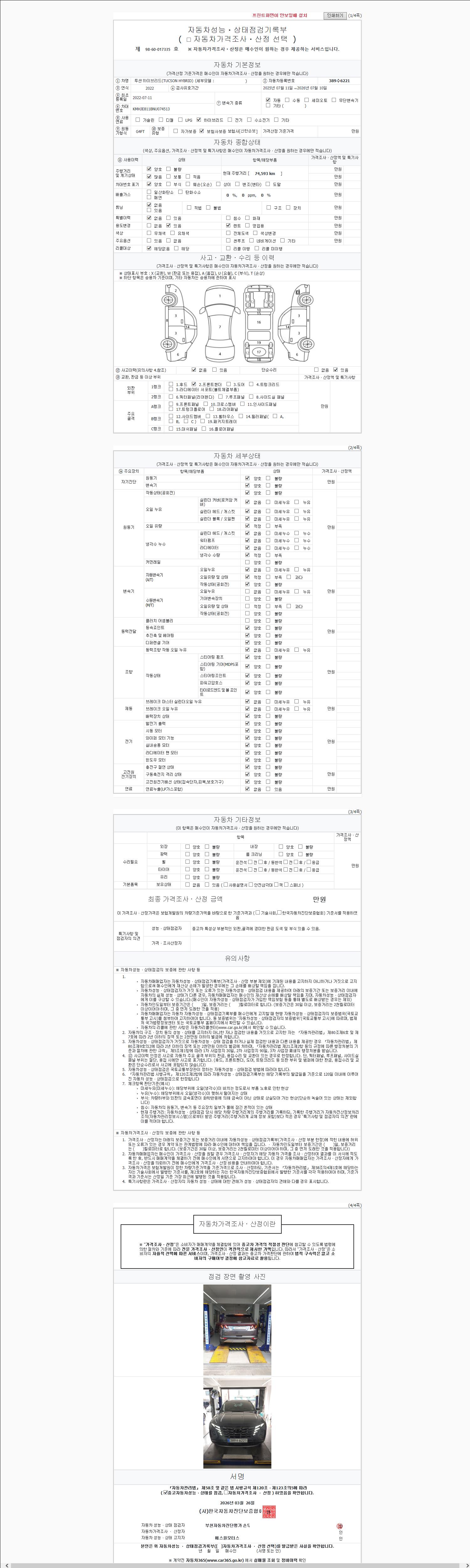 | 주행거리 | 74,599 km | 차량번호 | 389수6221 | 사고유무 | 성능기록부 참조 | 제시번호 | 제 2026059026 호 |