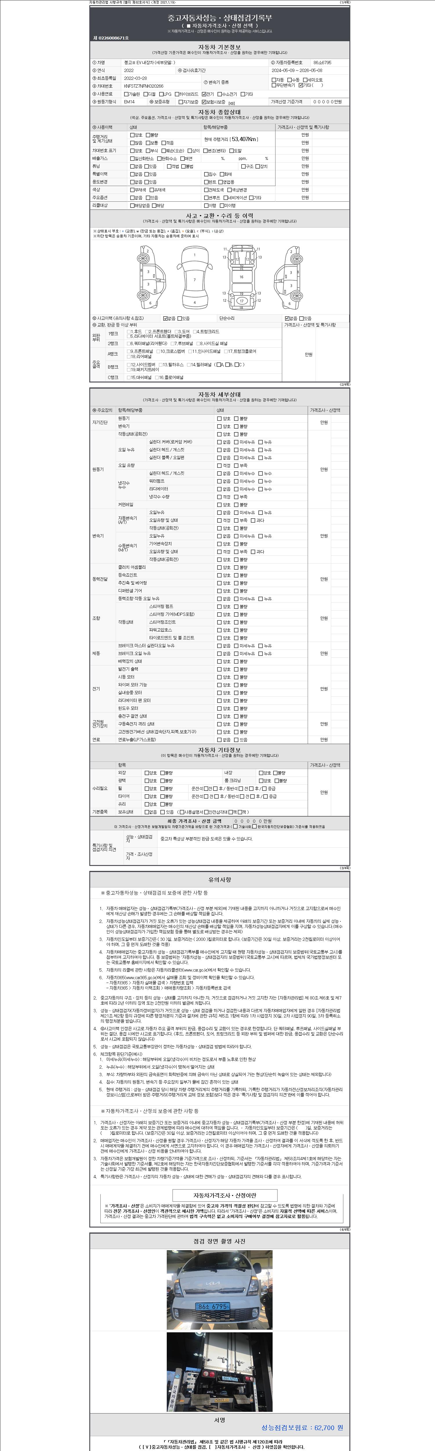 | 주행거리 | 53,407 km | 차량번호 | 86소6795 | 사고유무 | 성능기록부 참조 | 제시번호 | 제 2147483647 호 |