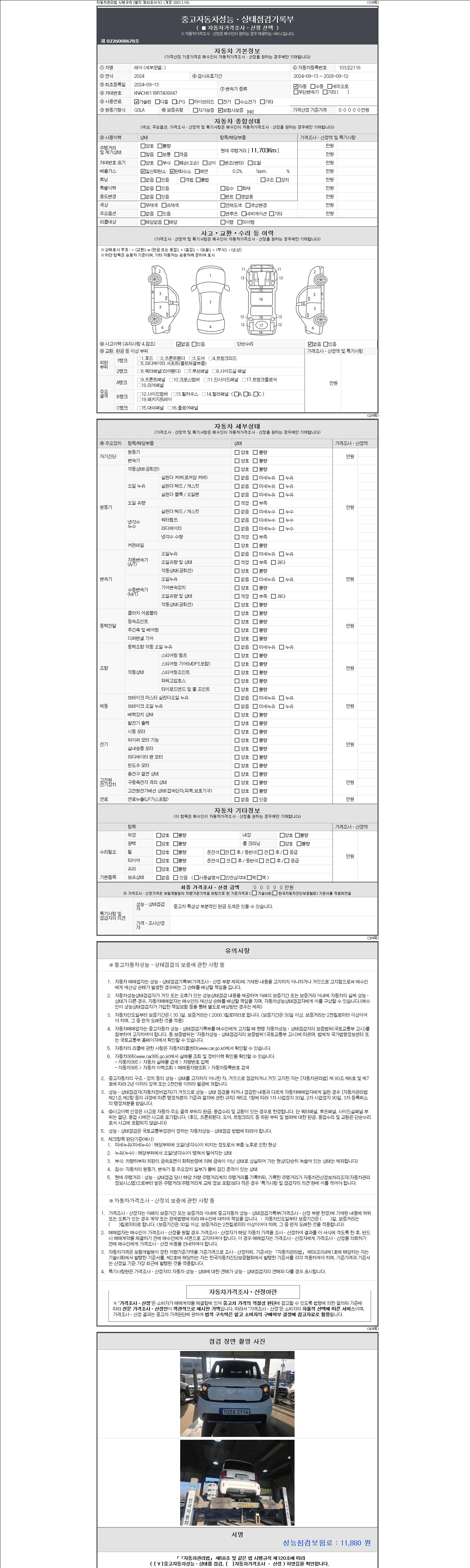 | 주행거리 | 11,703 km | 차량번호 | 103오2116 | 사고유무 | 성능기록부 참조 | 제시번호 | 제 2147483647 호 |